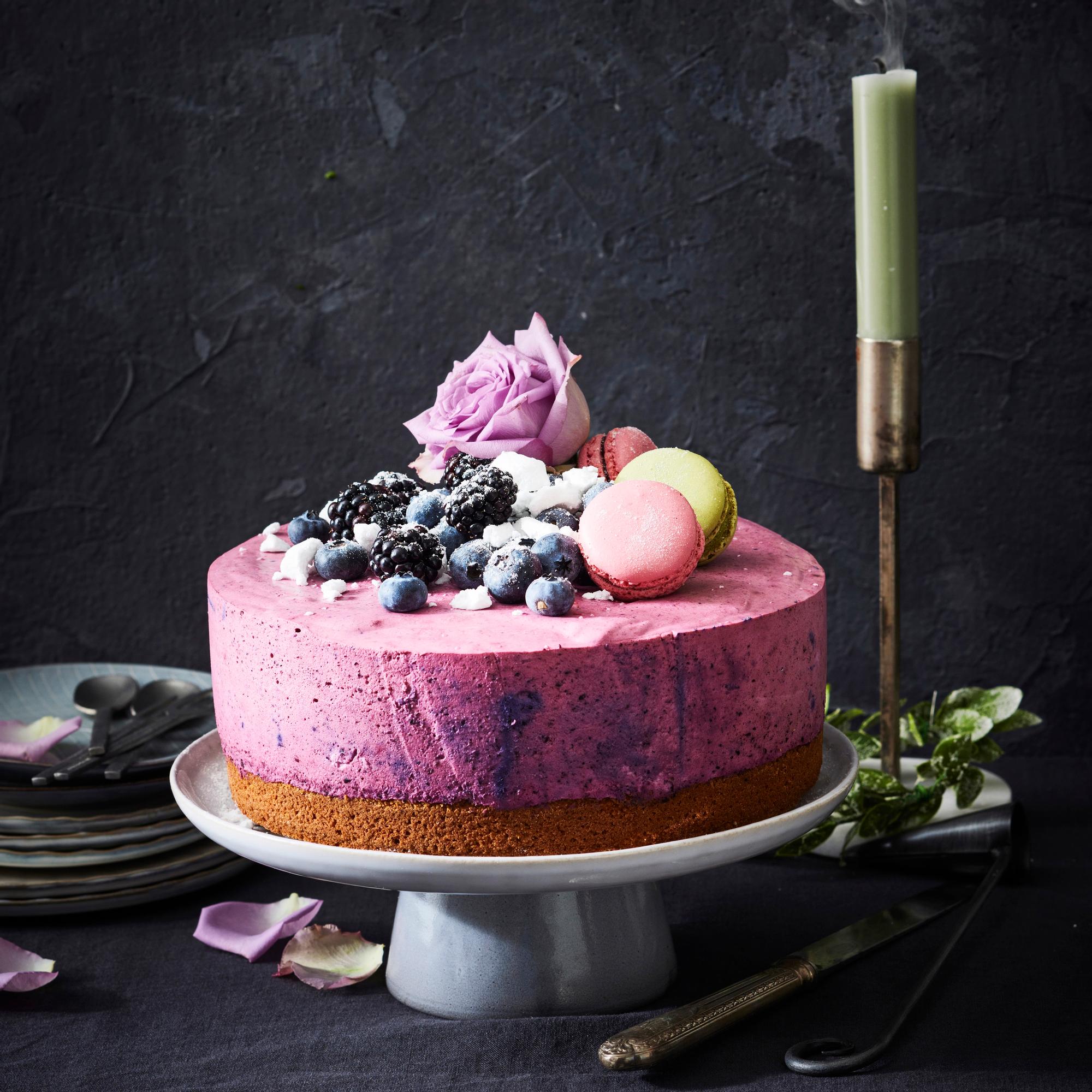 - Siirrä kakku tarjoiluvadille. Koristele mustikoilla, karhunvatukoilla, macaronseilla ja murennetulla marengilla. Päällystä ruusun varsi foliolla ja työnnä kakun päälle.