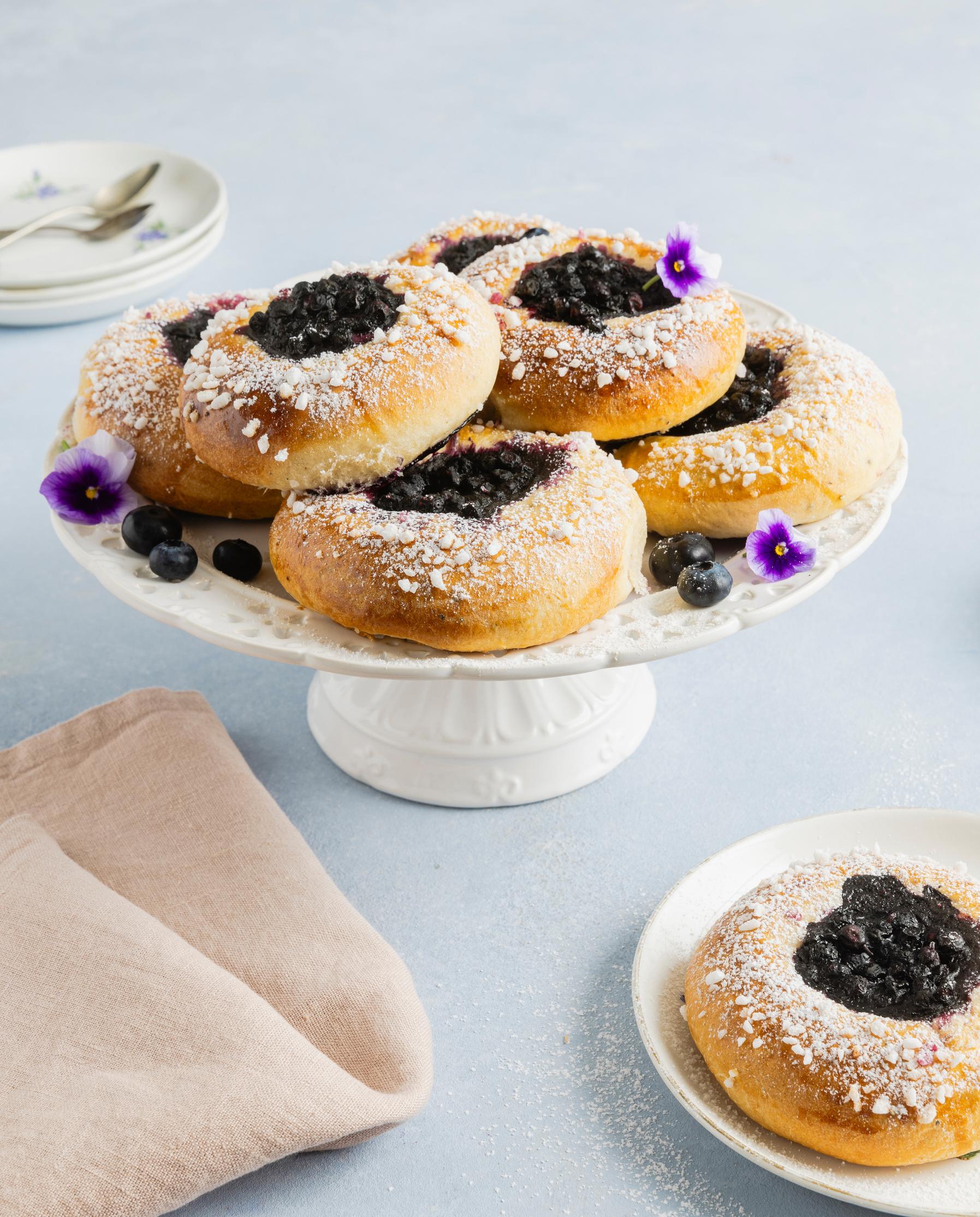Leivo kahvipöytään perinteisiä mustikkapullia. Pullataikinaan painetaan lasilla painauma, johon lusikoidaan mustikoita ja päälle ripotellaan rapeaa raesokeria.