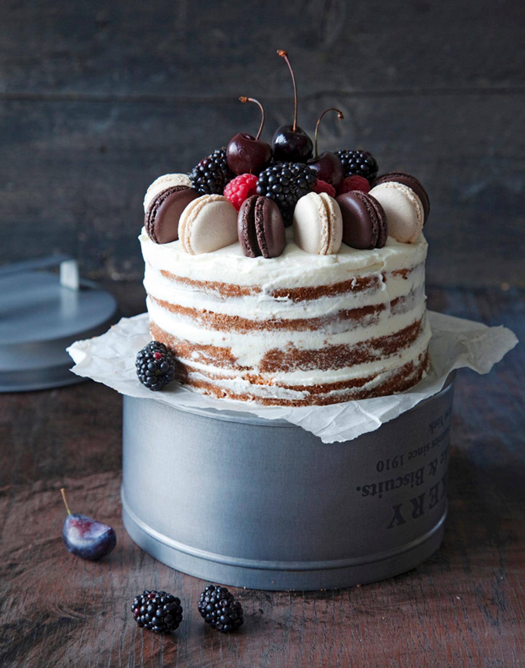 7. Koristele naked cake juuri ennen tarjoilua. Aseta macaronsit reunoille kehäksi ja täytä keskiosa marjoilla ja hedelmillä.