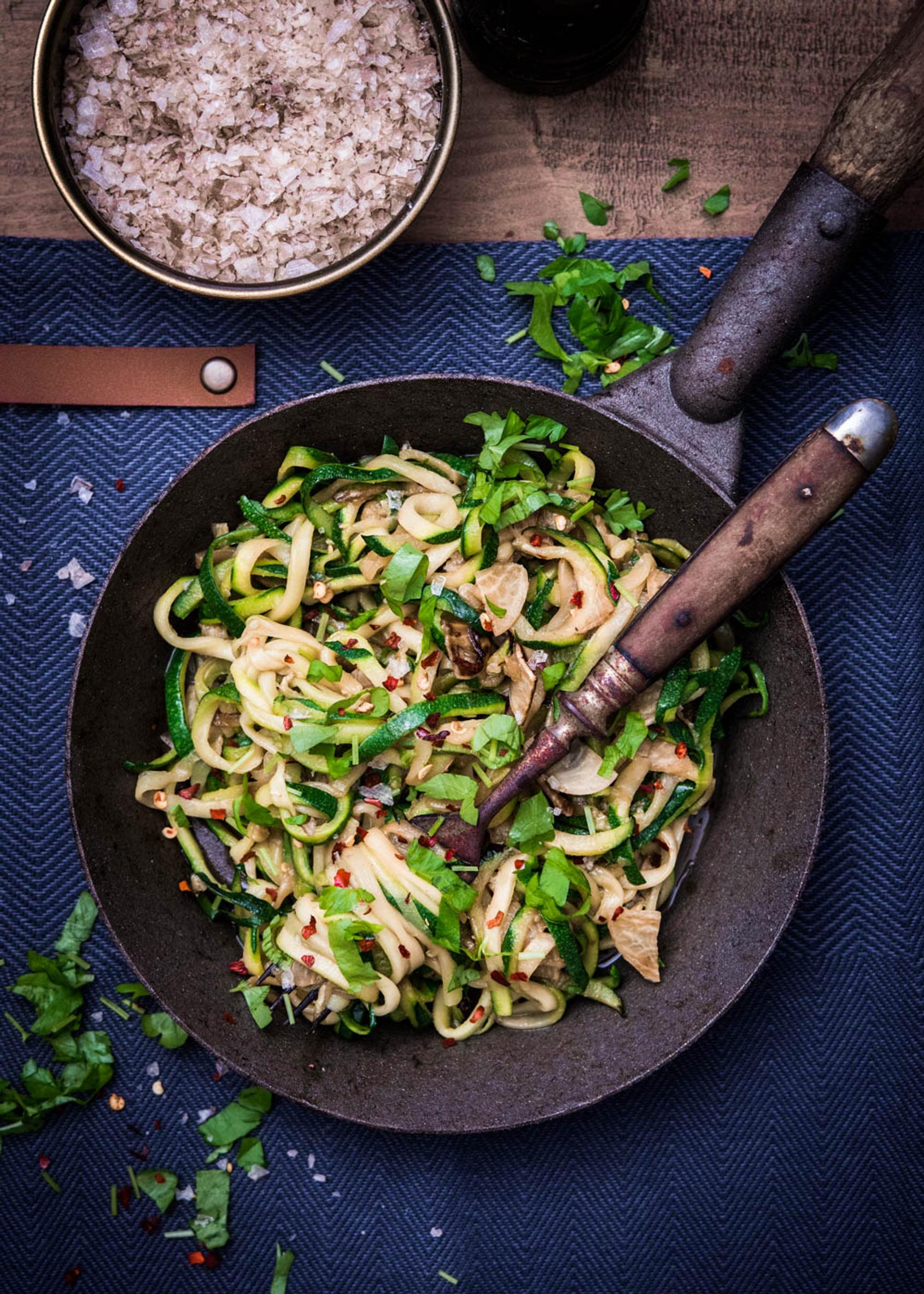 Paista kesäkurpitsapastaa noin 1–2 minuuttia. Sen ei tarvitse kypsyä kokonaan. Mausta sitruunamehulla, suolalla ja chilirouheella. Nauti heti.