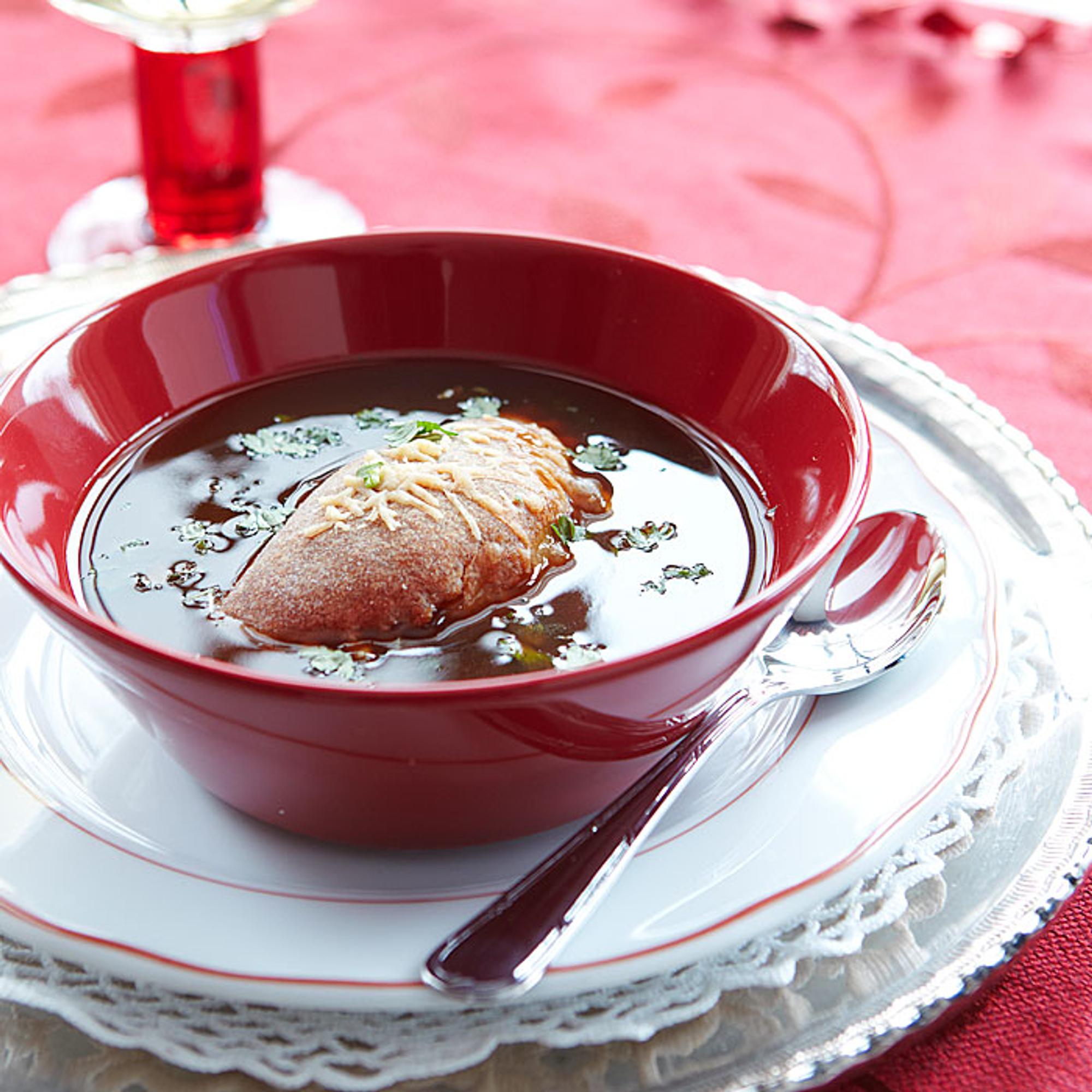 Kiehauta vesi ja annosfondit kattilassa. Sekoita. Lisää hienonnettu persilja lihaliemeen. Tarjoa nopea lihaliemi poro-piparjuuripiirakoiden kanssa.