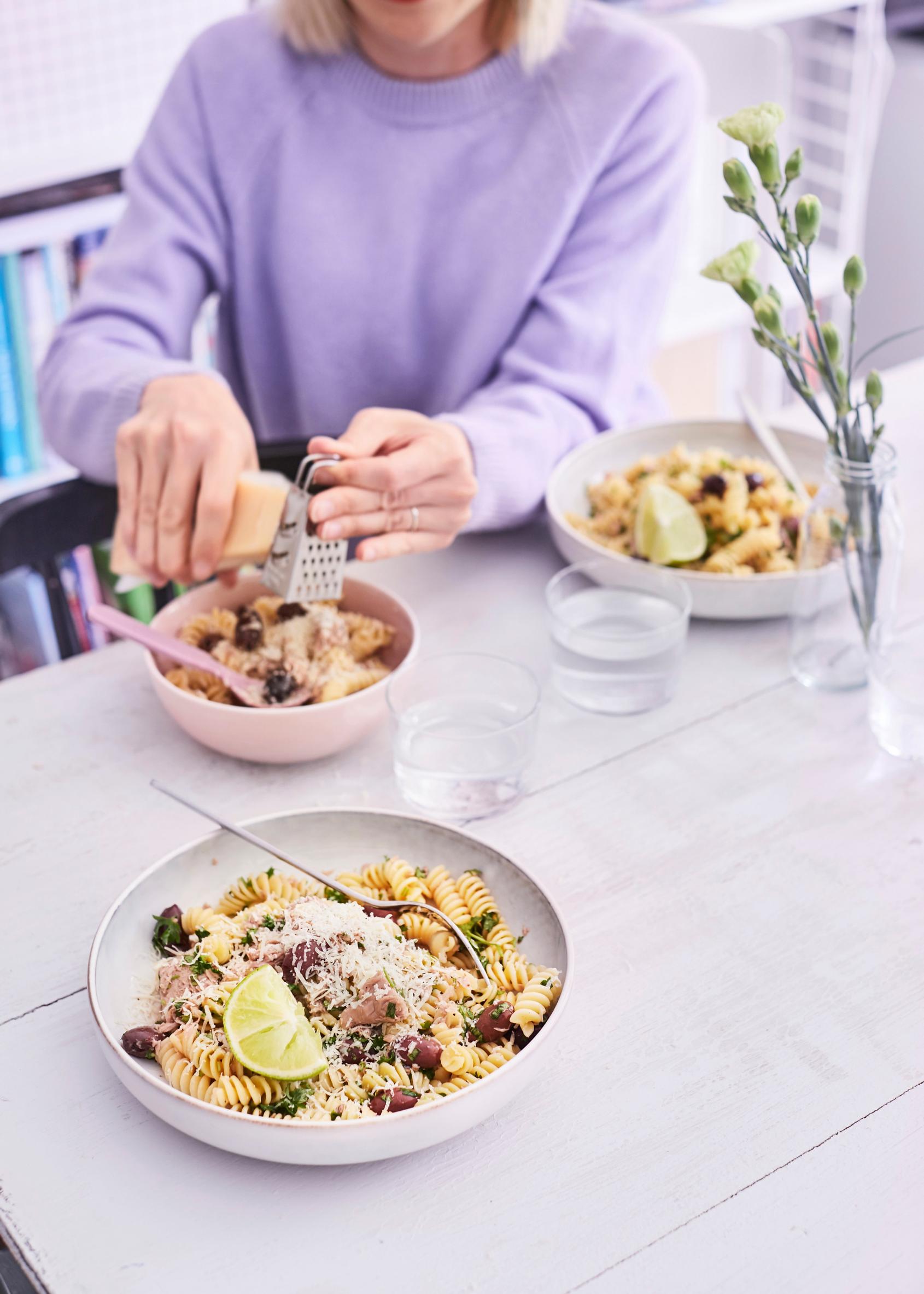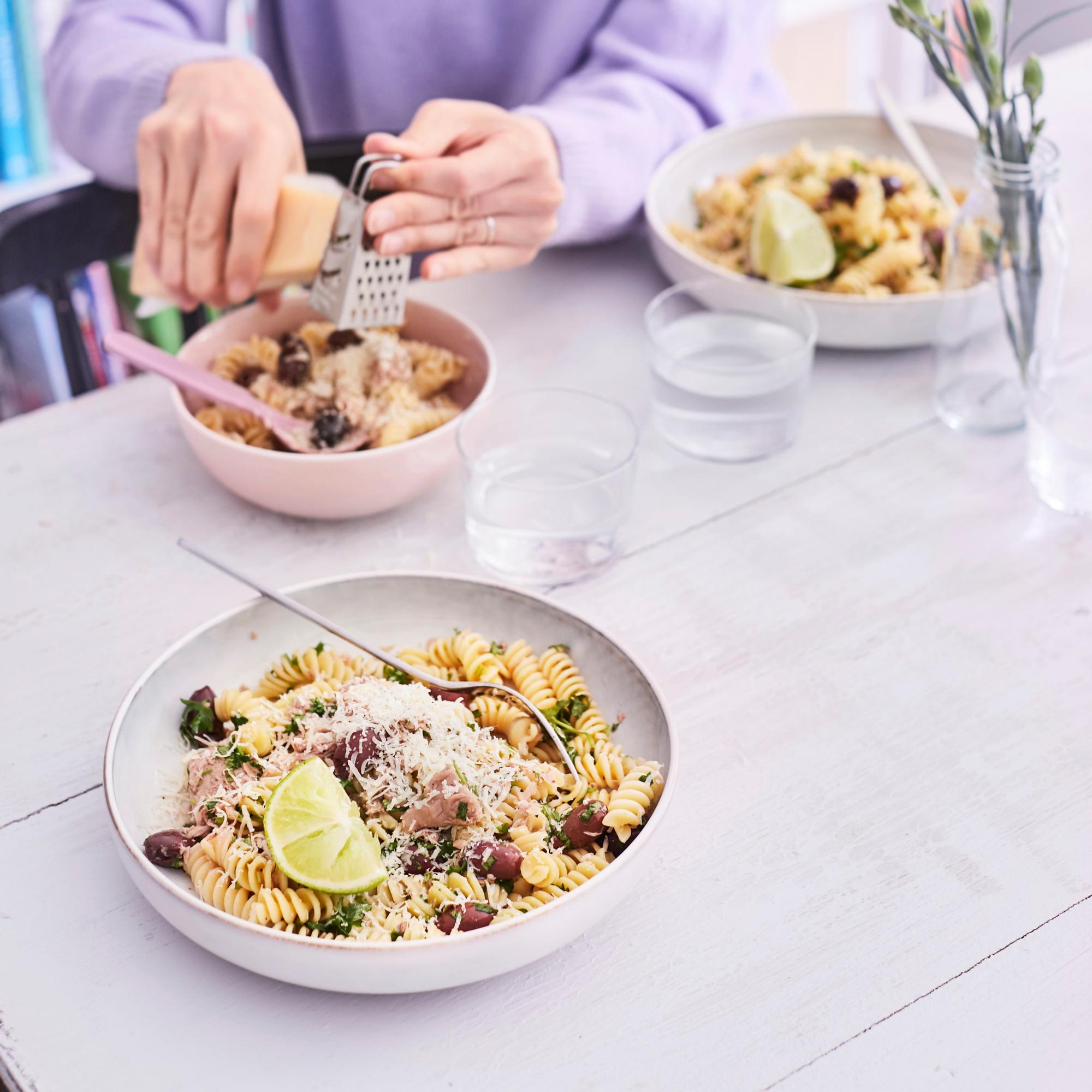 Ruokakirjailija Outi Väisäsen nopea tonnikalapasta on arjen pelastus, joka maistuu myös kylmänä. Makua pastaan tuovat lime, oliivit ja persilja – ja lapsille saa tehtyä helposti simppelimmän version. Nappaa herkullinen resepti!