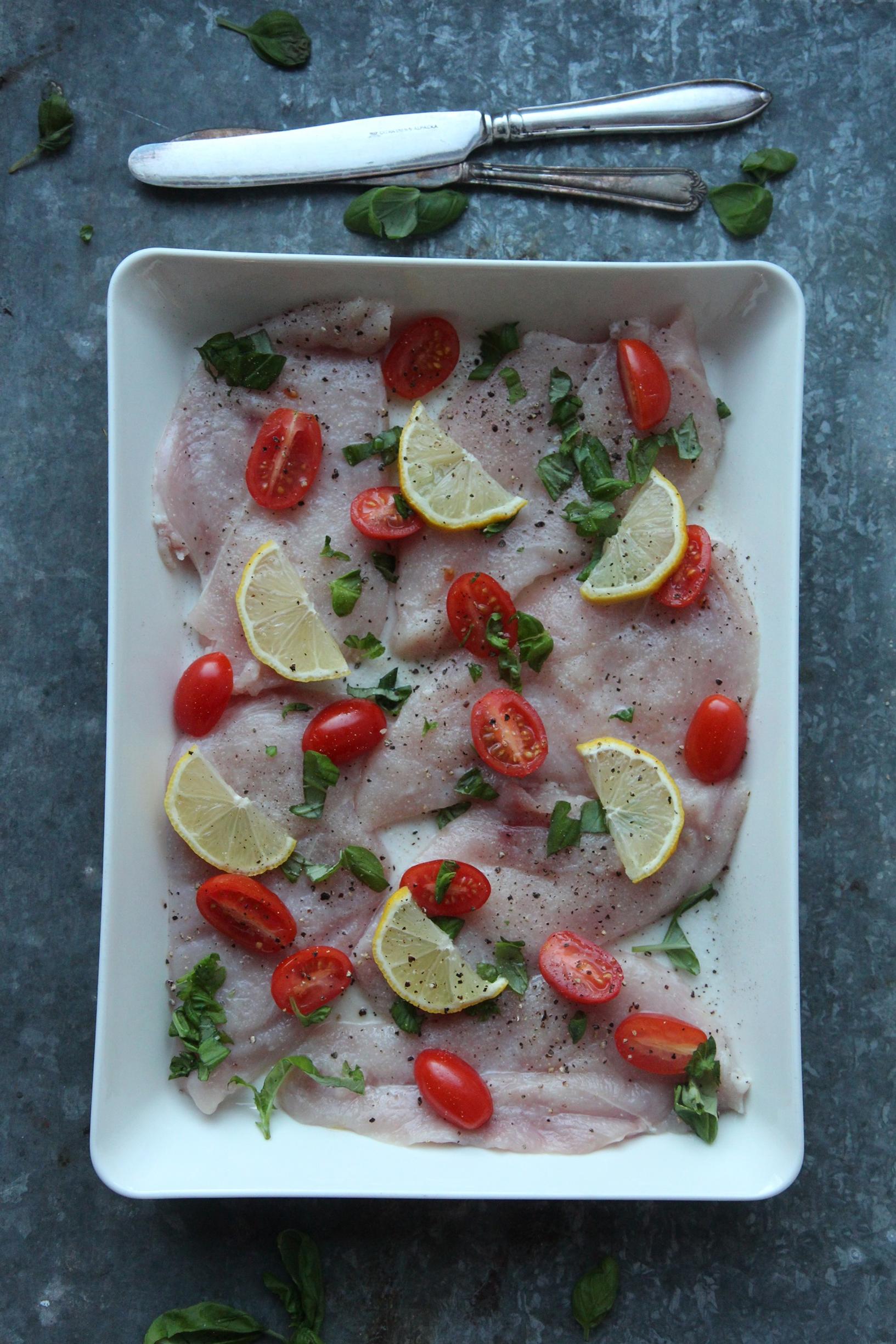 Kieritellään fileet oliiviöljyssä ja laitetaan laakeaan kulhoon. Lisätään päälle suolaa ja mustaapippuria sekä yrttisekoitus. Laitetaan fileiden päälle silputtu basilika, siivutetut valkosipulit, puolitetut luumutomaatit, sitruunalohkot ja kaadetaan lopuksi joukkoon valkoviini. Paistetaan fileitä 180 asteessa noin 15 minuutin ajan.