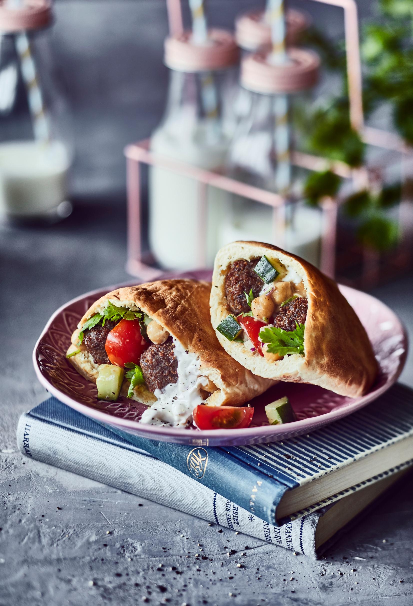 Kreikan ja Lähi-idän keittiöistä tutut täytetyt pitaleivät ovat ihanan helppo ja ruokaisa arkiruoka. Nopeiten saat ruoan pöytään, kun käytät kaupan valmiita pitaleipiä ja Nyhtökaura-pyöryköitä. Herkullisen annoksen kruunaa raikas tahini-sitruunavinegretti.