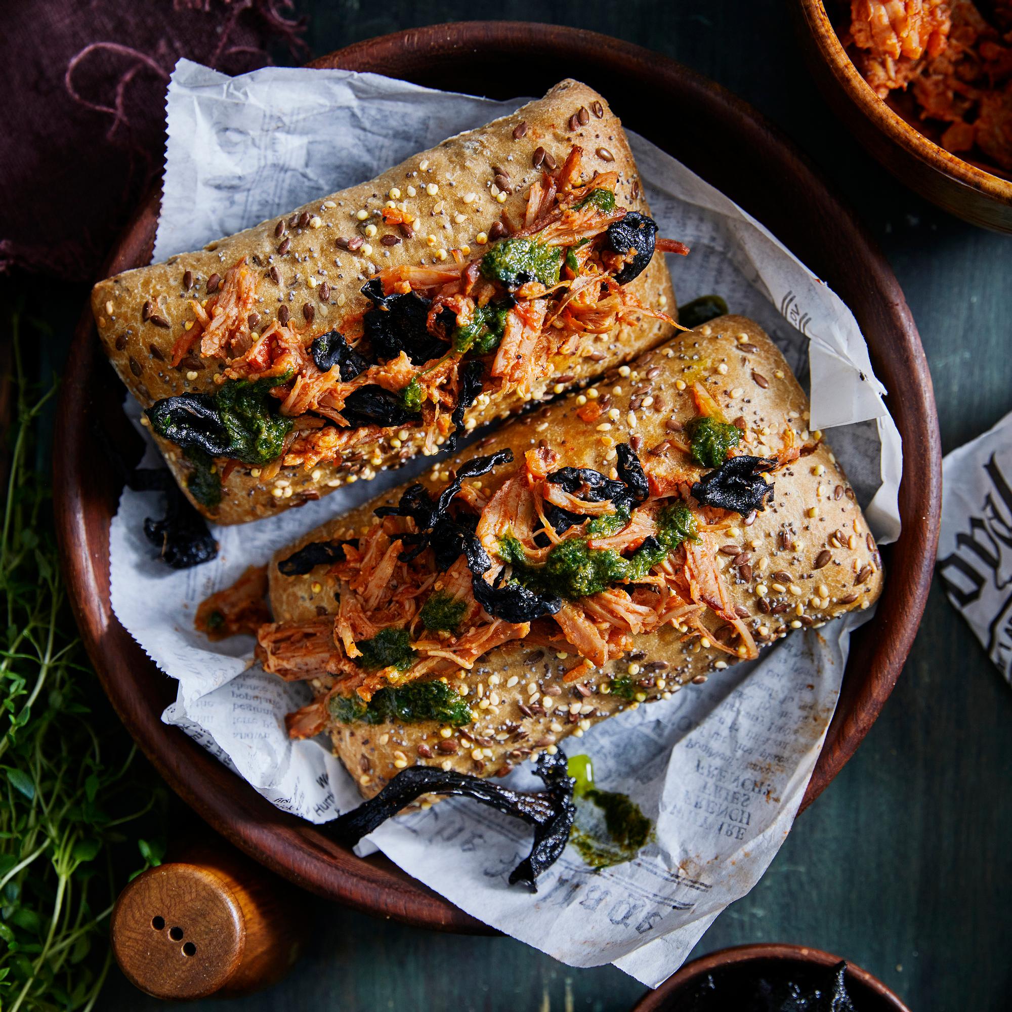 Superhoukuttelevat nyhtöpossu-sienitäytteiset sämpylät – rapeaksi paahdettuja mustatorvisieniä ja tacomaustettua nyhtölihaa