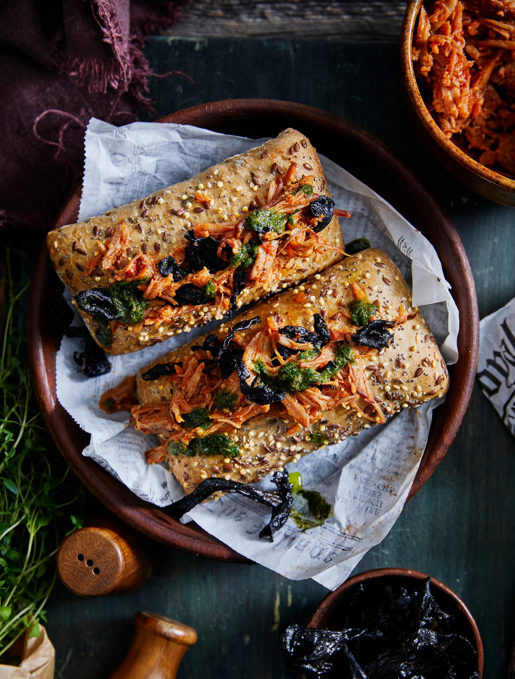 Sujauta sämpylän väliin tacomaustettua nyhtöpossua ja rapeaksi paistettuja mustatorvisieniä. Pakkaa paperiin ja nappaa ulos evääksi.