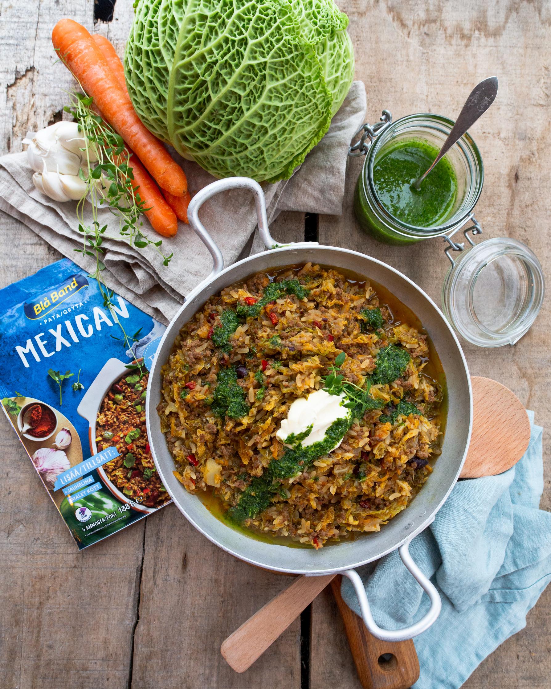 Rakastatko kaalipataa, mutta toivoisit sen valmistuvan nopeammin? Tämä kaalipata syntyy Blå Bandin Mexican-padasta ja nopeasti kypsyvästä savoijinkaalista. Viimeistele maukas pata kotitekoisella yrttiöljyllä.