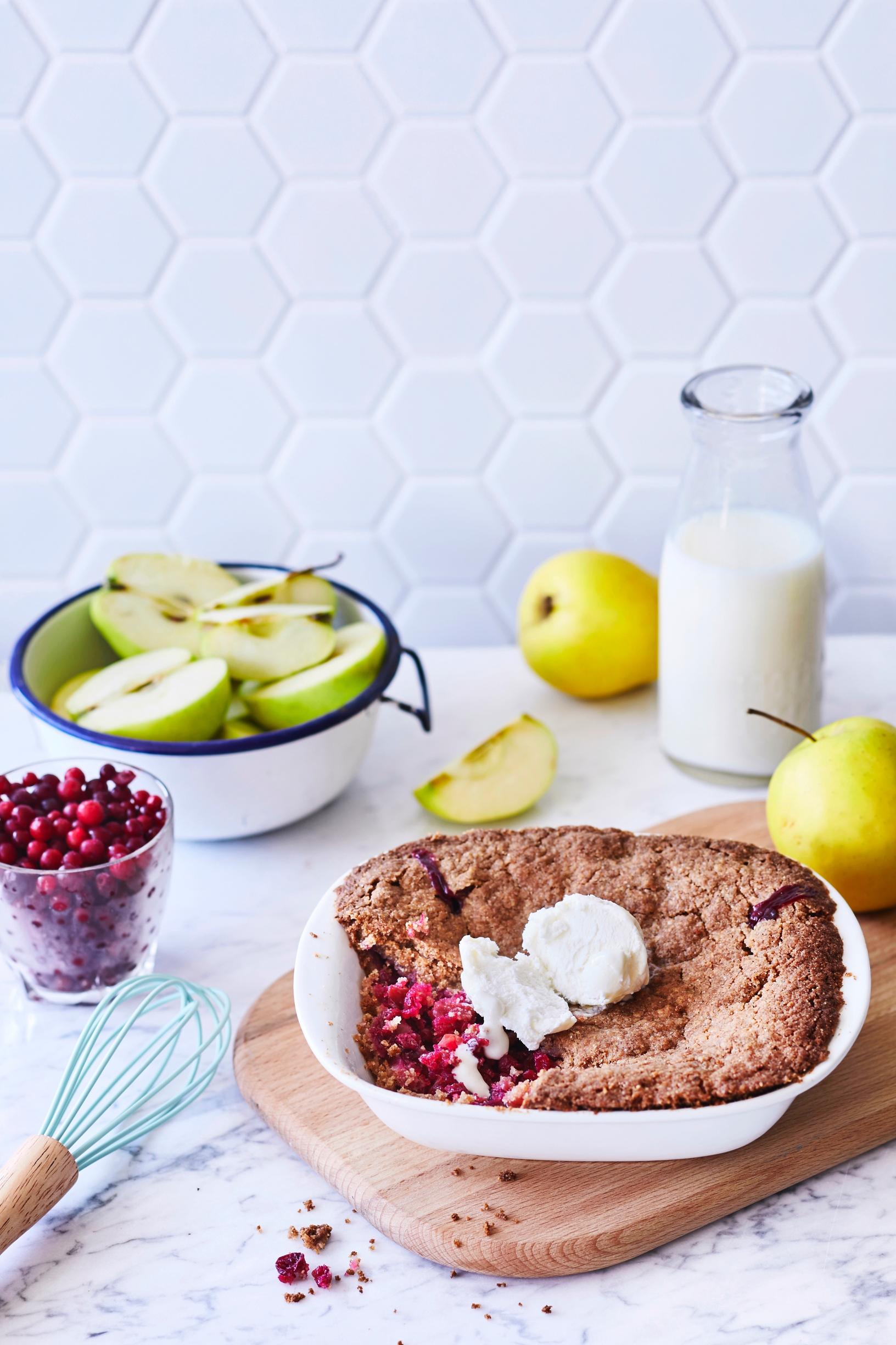 4. Kypsennä omena-puolukkakukkoa uunin keskitasolla noin 60 minuuttia. Tarjoa lämpimänä vaniljajäätelön tai -kastikkeen kanssa.