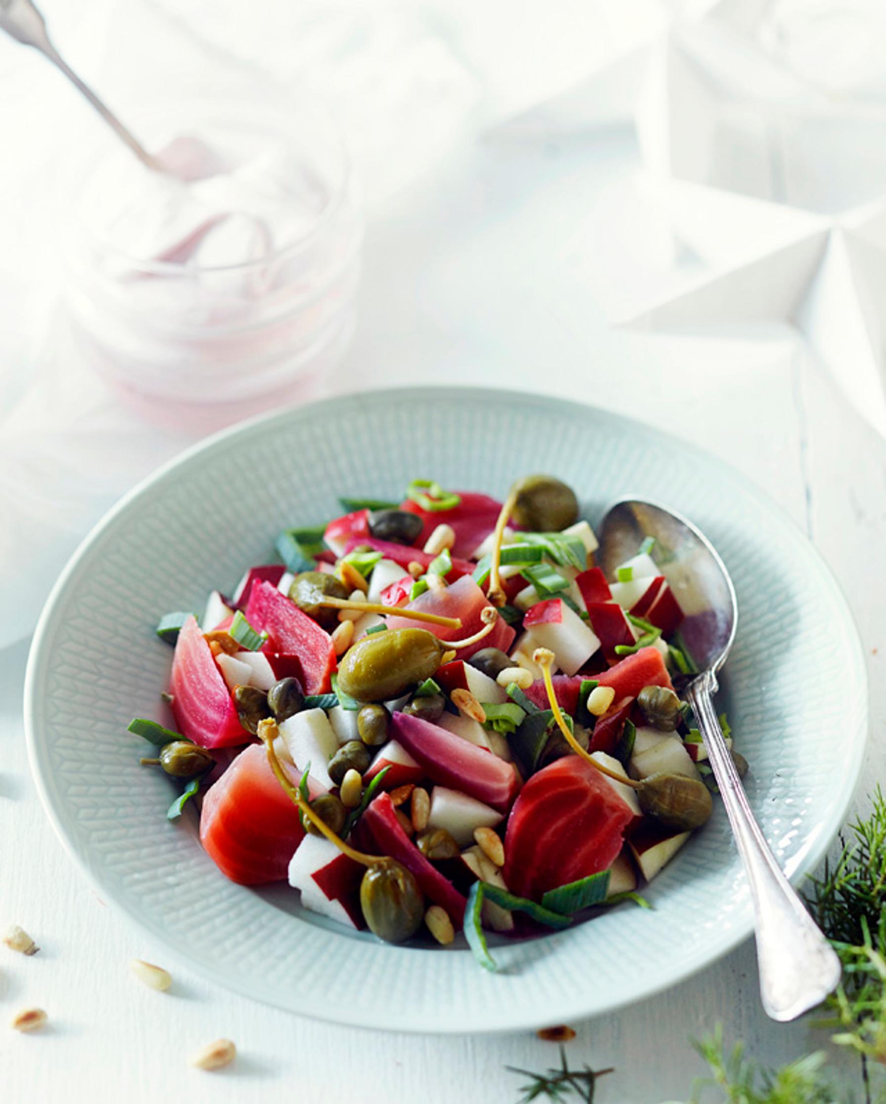 - Paahda pistaasit. Yhdistä punajuurilohkot, omenat, purjoviipaleet, kaprikset ja paahdetut pistaasit tarjoiluastiassa. Koristele varrellisilla kapriksilla.