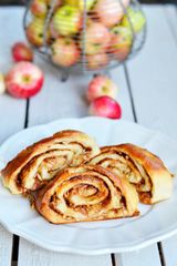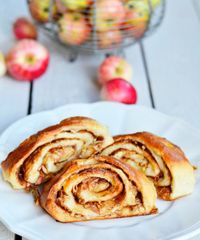 - Vaivaa taikinasta pois ilmakuplat, ja kaada se jauhotetulle alustalle. Kauli taikinasta ohuehko, neliskanttinen (45 cm × 45 cm) levy. Levitä päälle voiseos. Leikkaa levy pituussuunnassa 3 sentin suikaleiksi. Aseta joka suikaleen yläreunaan rivi omenaviipaleita osittain päällekkäin, kaareva reuna hieman taikinan reunan yläpuolella. Kieritä suikaleet rullalle.