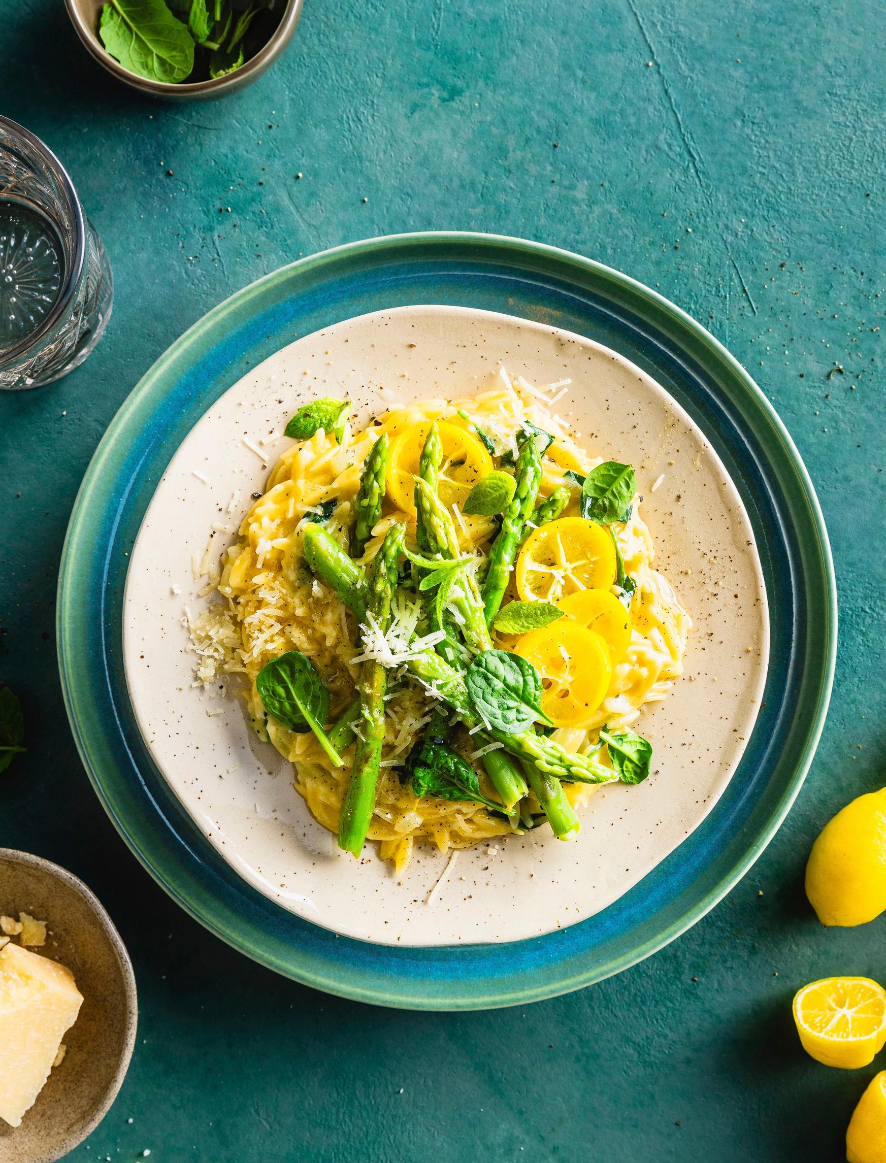 Tämä resepti on ratkaisu, kun et osaa päättää kokkaisitko risottoa vai pastaa. Parsa, sitruuna ja pinaatti tekevät ruoasta raikkaan ja täydellisen keväisen.
