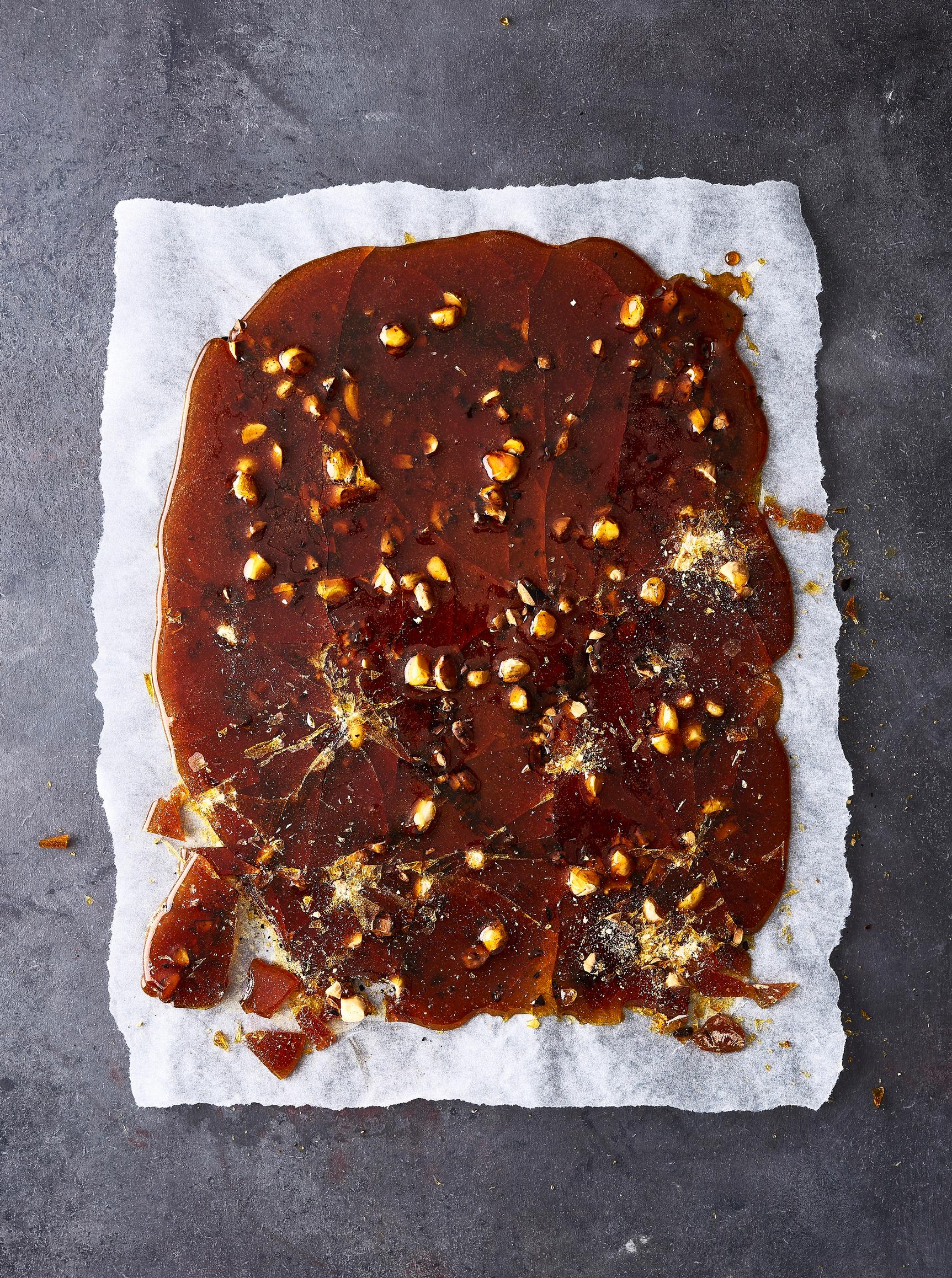 - Rouhi krokanttilevy veitsellä. Voit murskata krokantin myös kahden leivinpaperin välissä lihanuijalla.