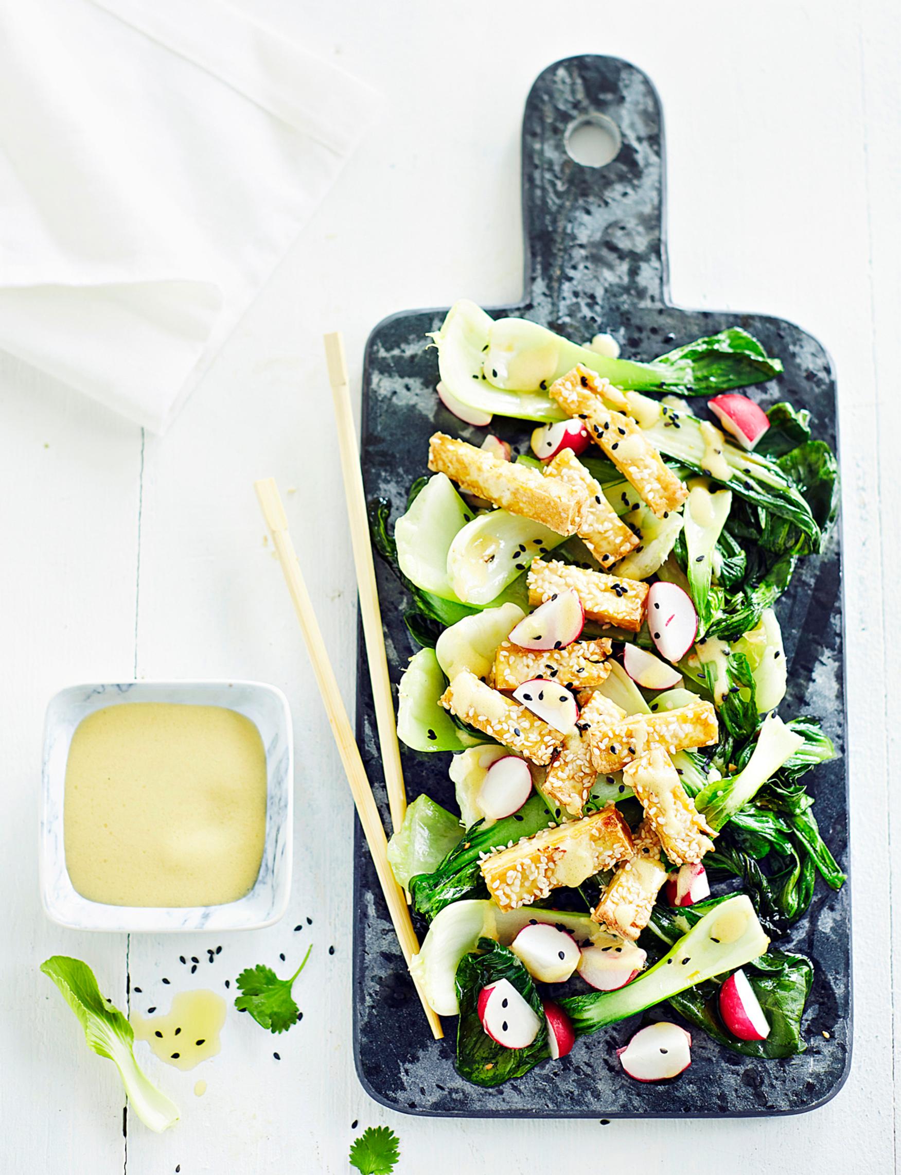 Paksoi-tofusalaatissa paksoi on parhaimmillaan: vokattuna valkosipulin ja inkiväärin kanssa ja tarjottuna rapeaksi paahtuneen tofun kera. Suosittelemme!
