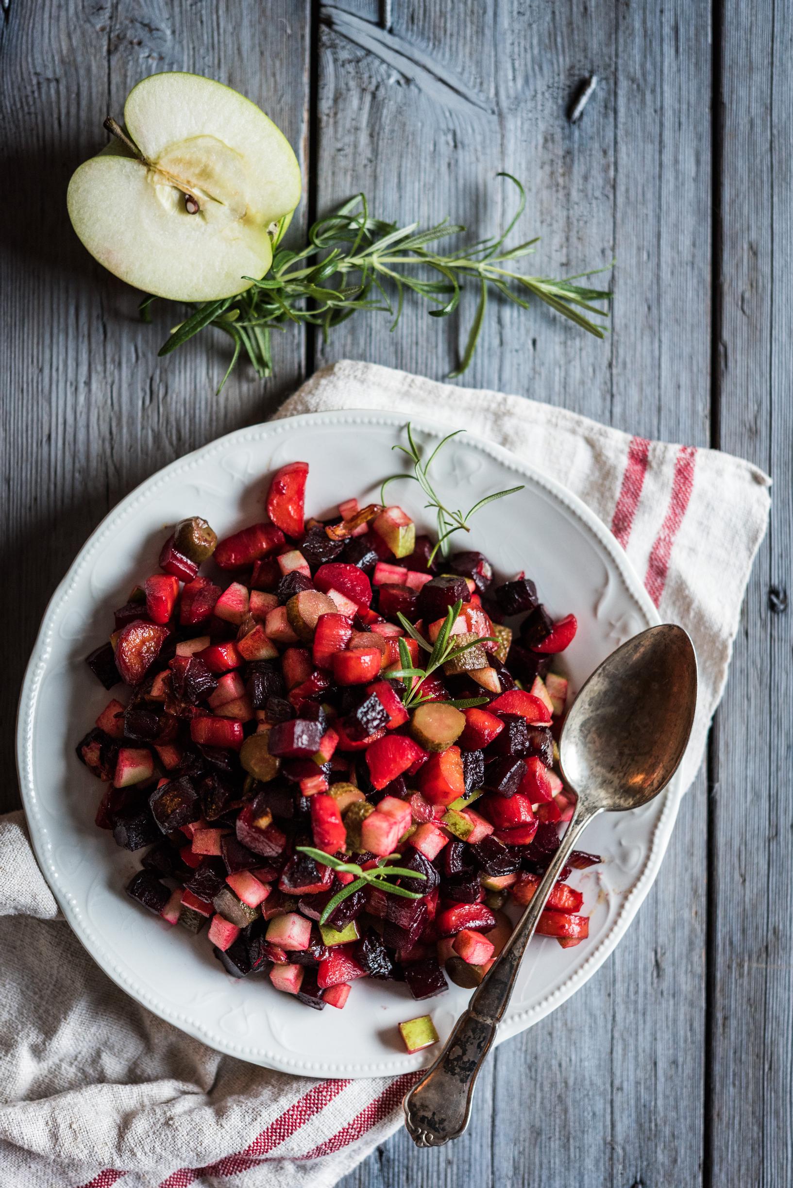 Paahdettu rosolli on perinteistä versiota täyteläisemmän makuinen. Lopuksi joukkoon sekoitetaan omena- ja suolakurkkukuutiot. Tämä maistuu hyvältä niin lämpöisenä kuin kylmänäkin.