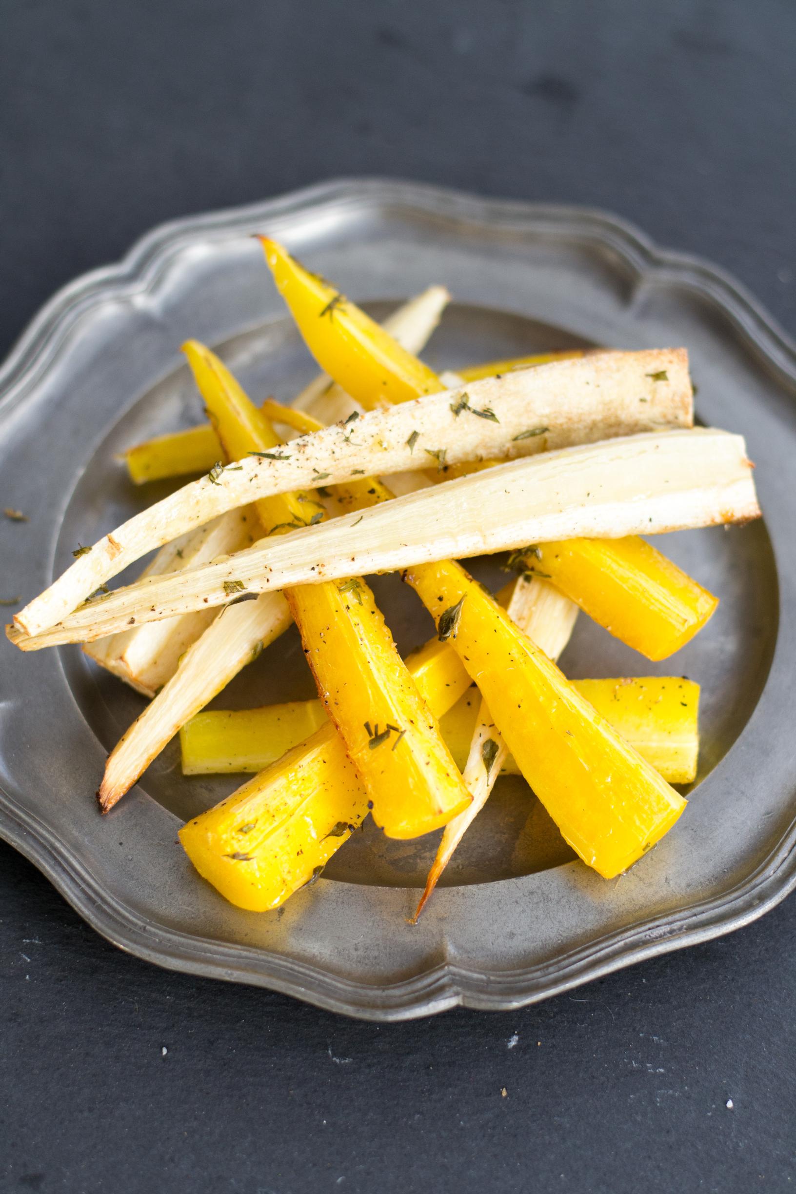 Paahda palsternakkoja ja porkkanoita uunissa 200 asteessa 30-40 minuuttia kunnes ovat kypsiä.
