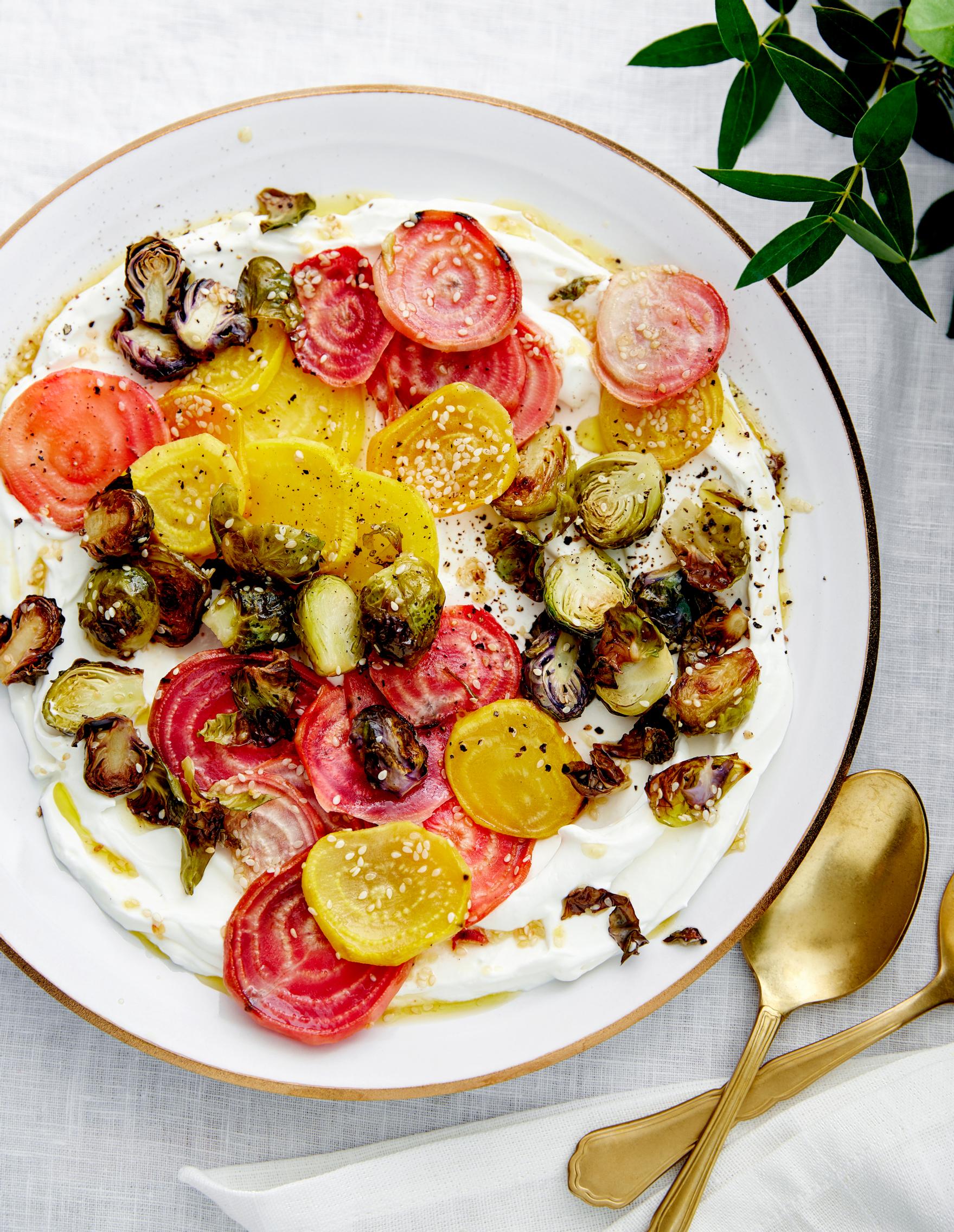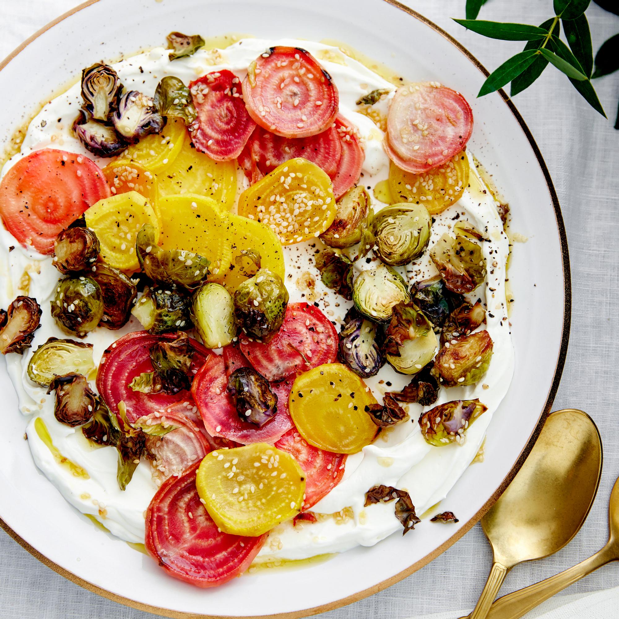 Paahdetut uunikasvikset – makeiksi paahtuneet kasvikset tarjotaan täyteläisen vuohenjuustovaahdon päällä