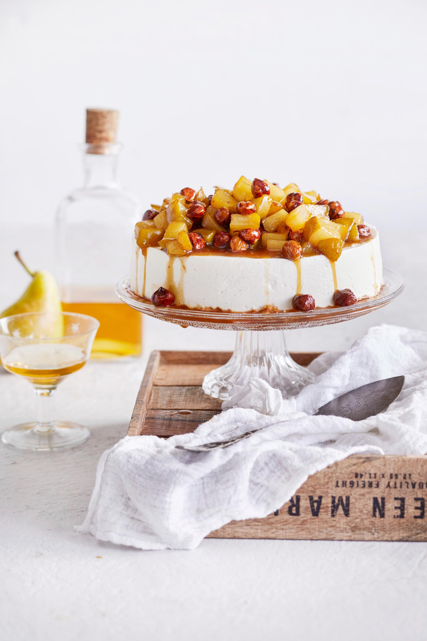 Päärynä-kinuskikakku saa pinnalleen vastustamattoman kuorrutuksen. Päärynät ja hasselpähkinät haudutetaan päärynä-konjakkiliköörillä maustetussa paahdetussa sokerissa. Juustokakun keksipohjan salaisuus on kinuskikastike ja ripaus suolaa.