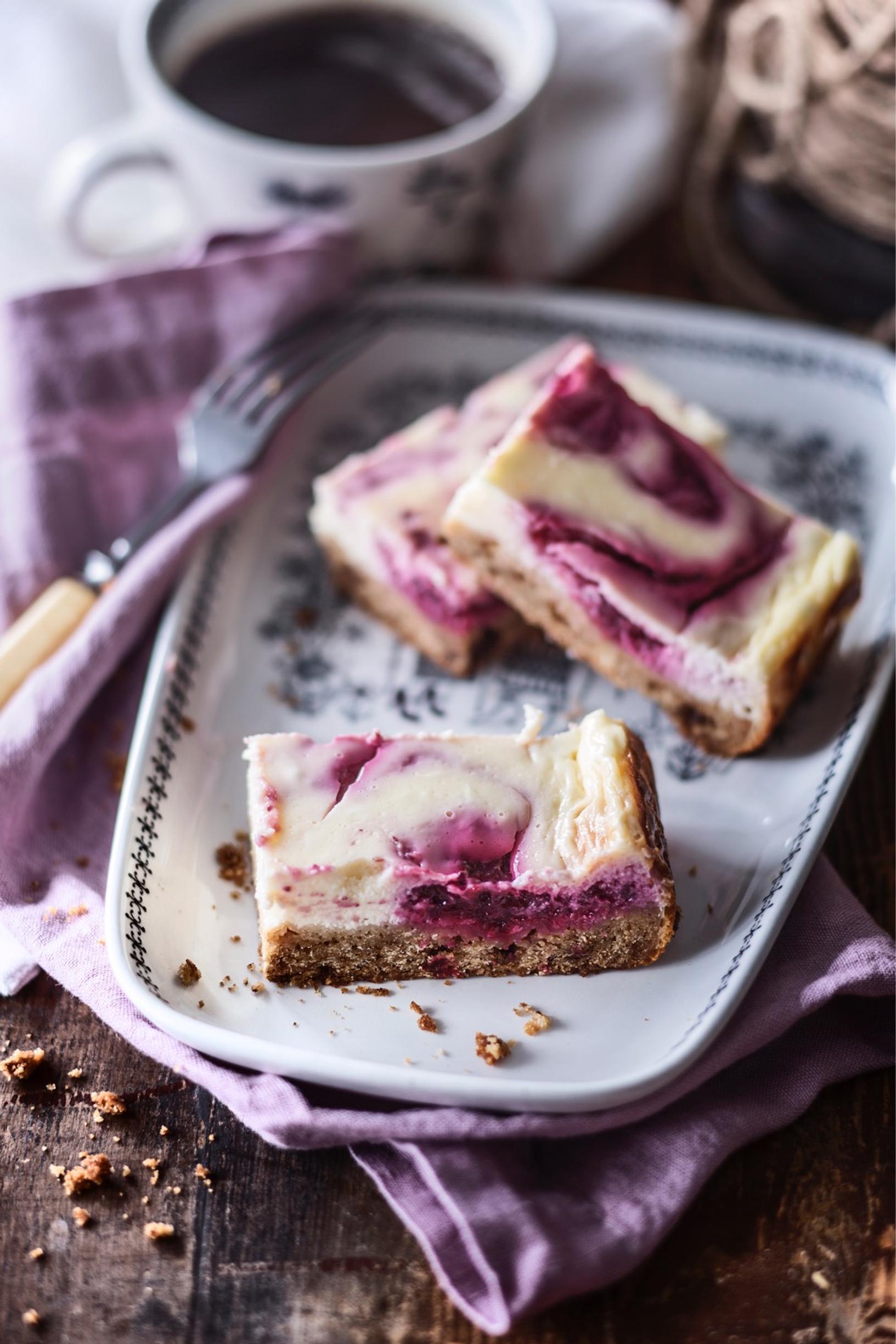 - Lisää täytteen päälle puolukkasosetippoja. Vedä soseen läpi rennosti haarukalla, jotta pintaan syntyy marmorikuvioita.