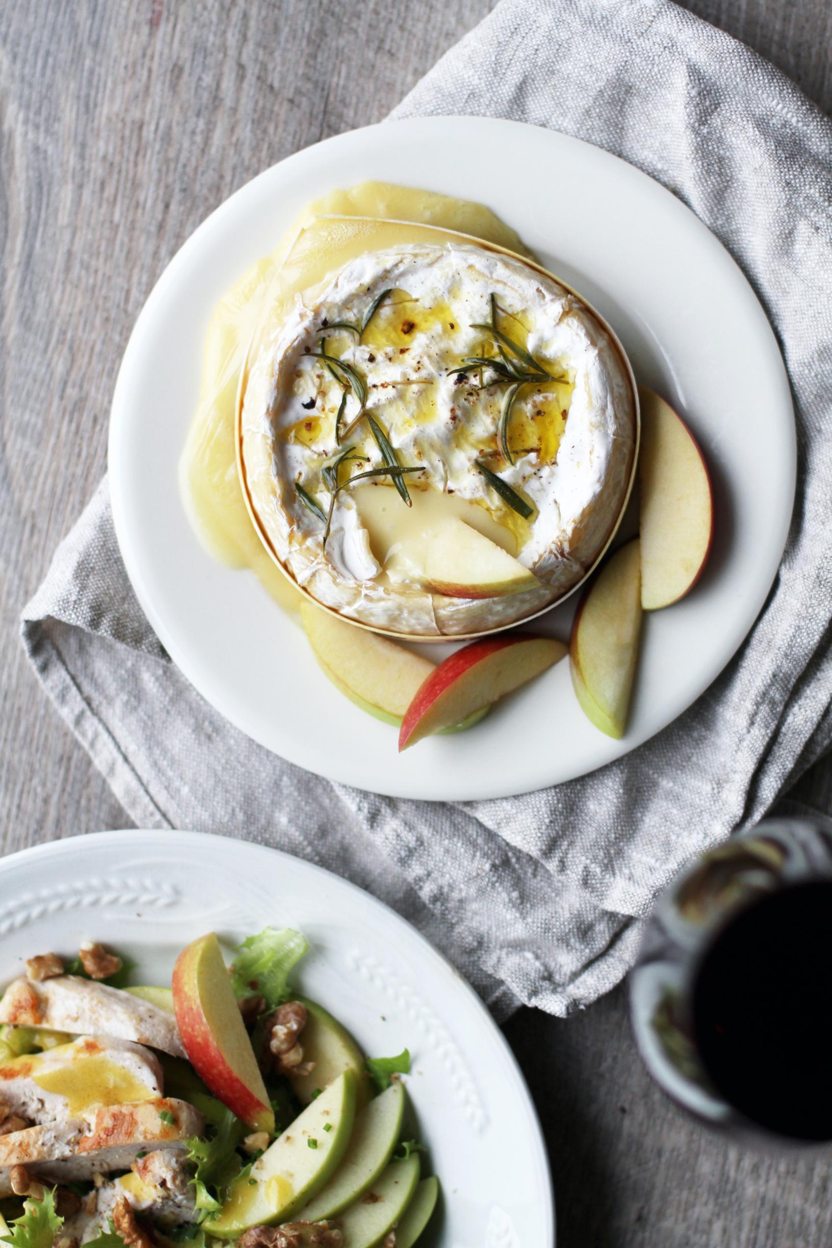 Camembert-juusto sulaa uunissa ihanaksi juustodipiksi. Mausta juusto lorauksella oliiviöljyä ja rosmariinia. Nauti vaikkapa omenasiivujen ja leivän kanssa!