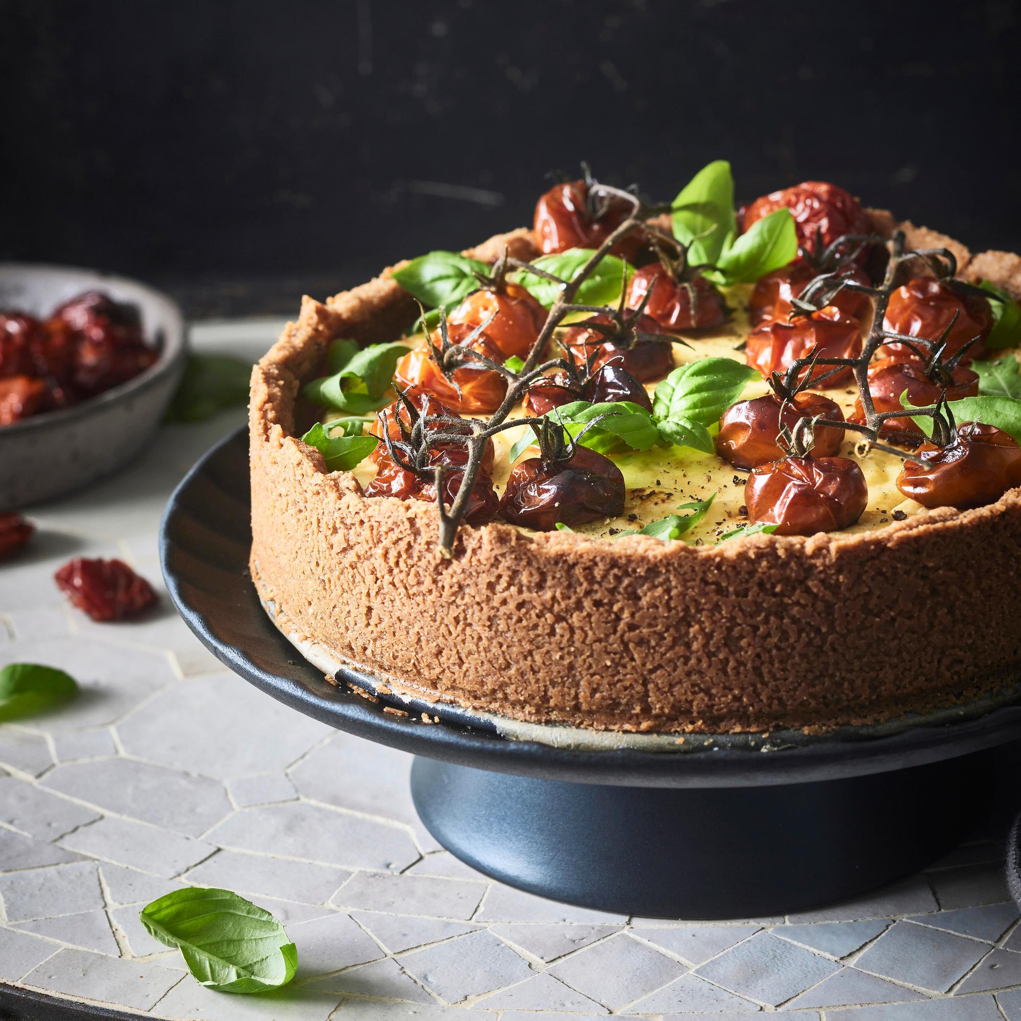 - Irrota kakku vuoasta ja laita tarjoilulautaselle. Koristele paistettu fetajuustokakku puolikuivatuilla tomaateilla ja basilikalla.