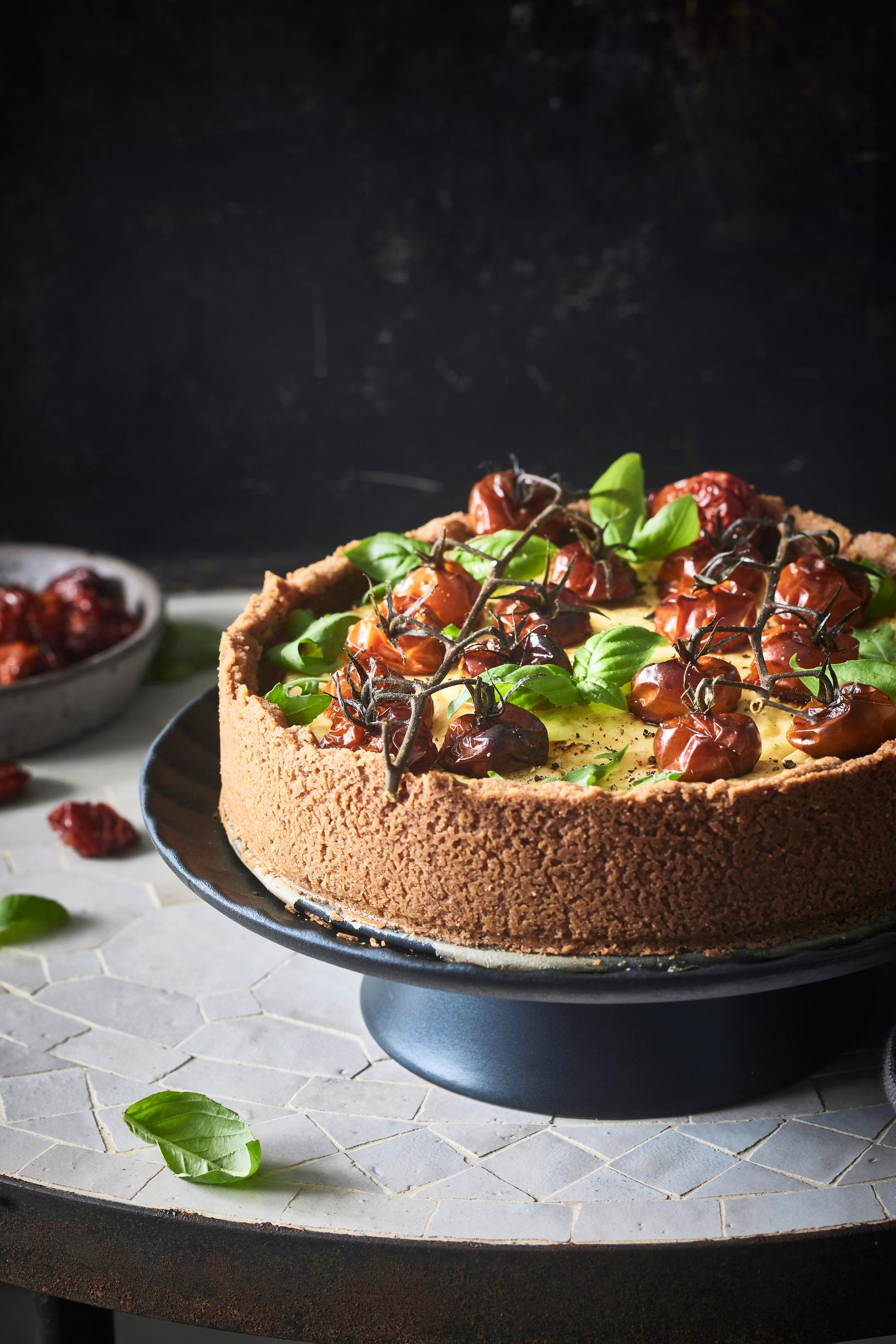 Paistetussa fetajuustokakussa yhdistellään koostumukseltaan ja voimakkuudeltaan erityyppisiä juustoja. Fetan makua pehmentävät ricotta ja perinteinen tuorejuusto. Kakku viimeistellään puolikuivatuilla tomaateilla ja basilikalla.