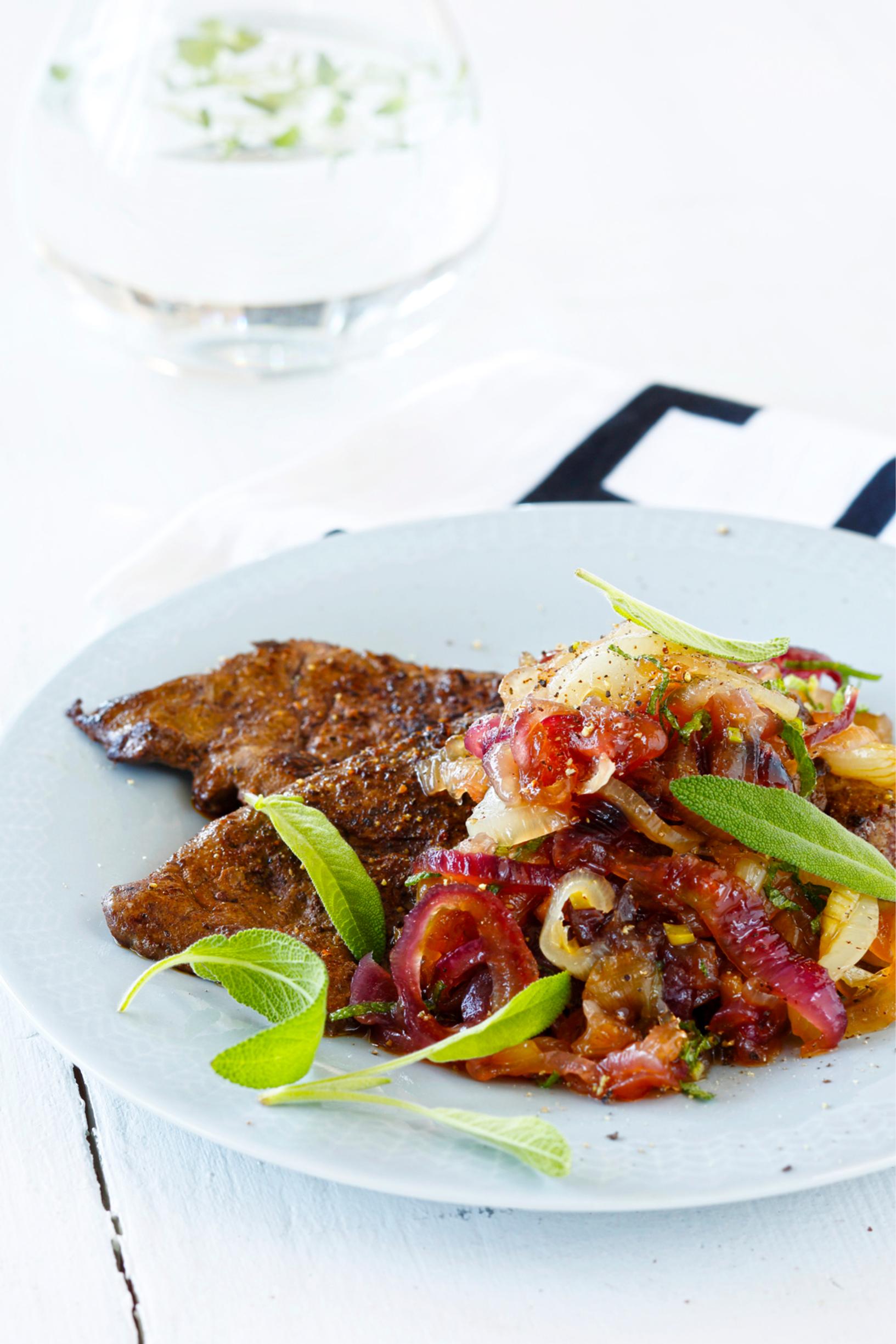 Paistettu maksa ja hunajaiset sipulirenkaat