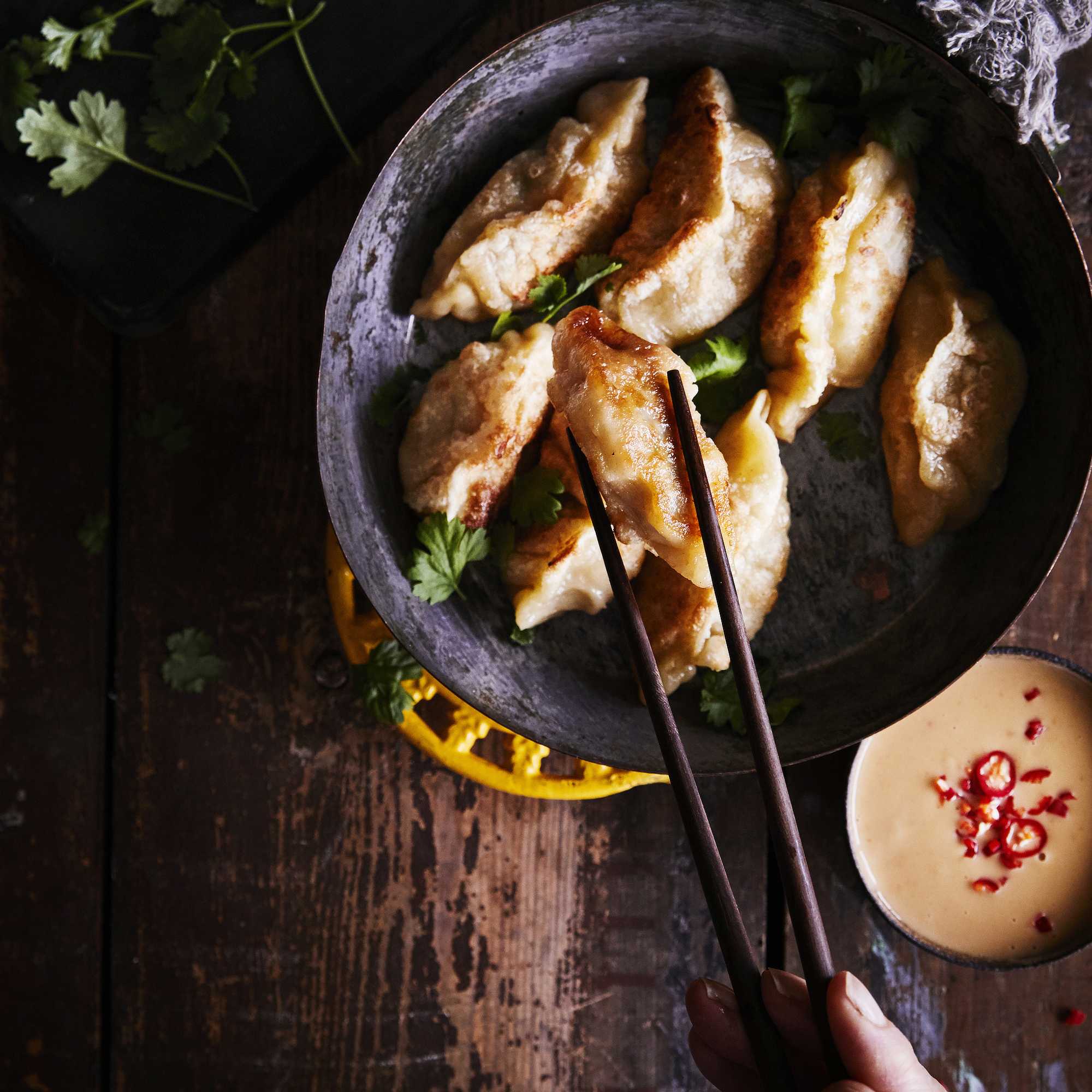 Paistetut dumplingit saavat pannulla rapean ja maukkaan pinnan! Aasialaisten taikinanyyttien broileritäytteessä maistuvat ihanasti valkosipuli, inkivääri ja korianteri. Massaan sekoitettava kuuma öljy lisää täytteen mehevyyttä.