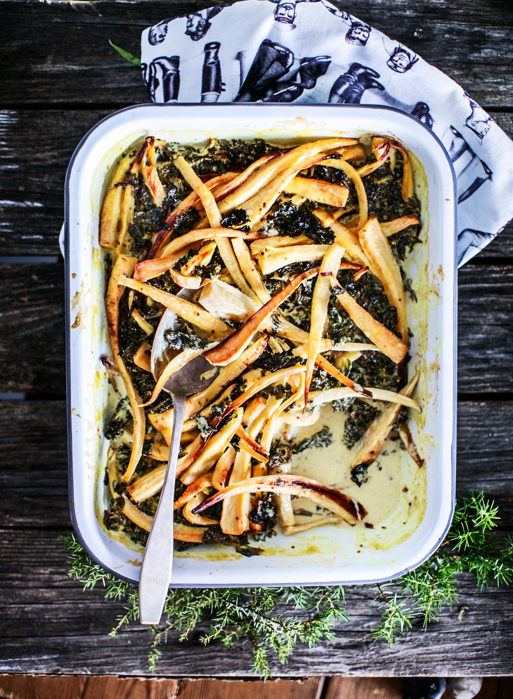 Palsternakka-lehtikaaligratiini – vieno sinapin maku tekee vuokaruoasta täydellisen parin paistille