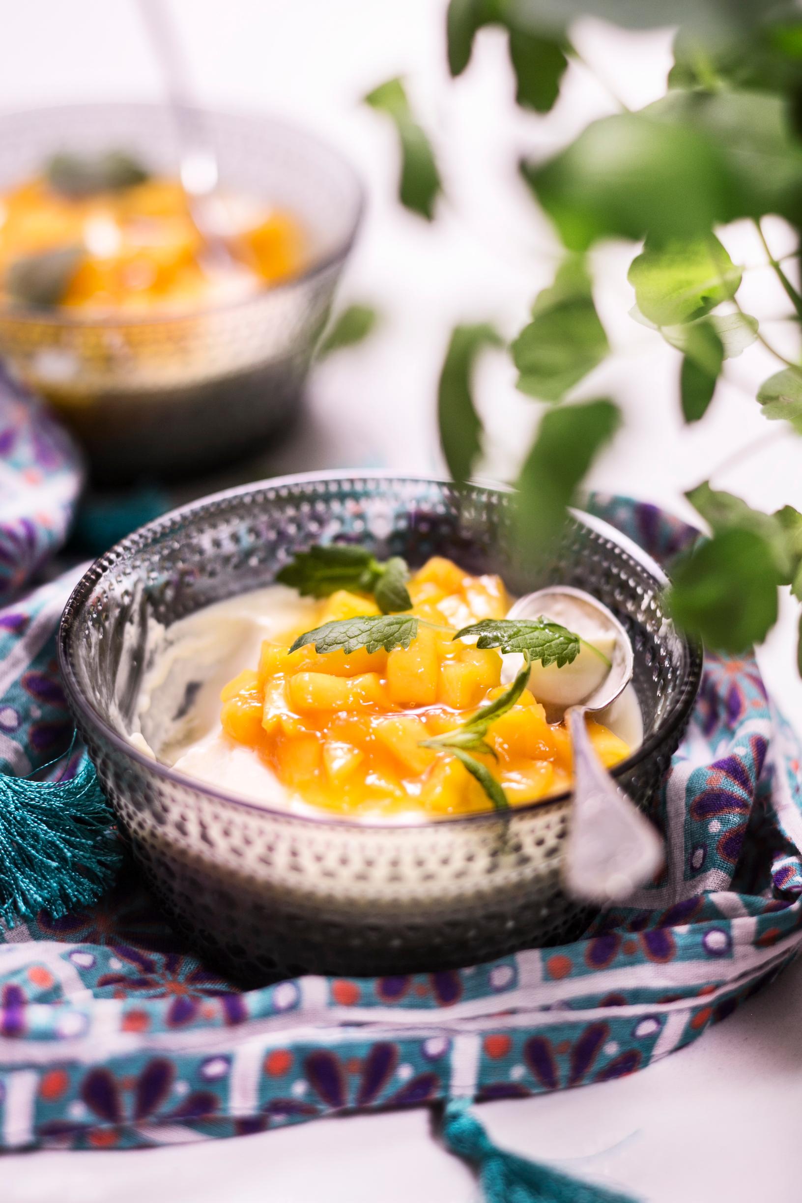 - Tarjoa pannacotta hedelmien, marjojen tai hillon kera. Kuvassa näkyvän mangosalsan saat sekoittamalla pieneksi kuutioidun mangon joukkoon hienonnettua minttua. Raikas hedelmälisäke sopii ihanasti pannacotan seuraksi.
