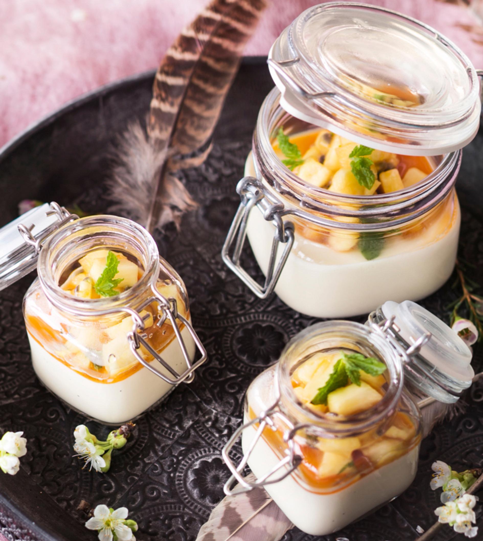 - Annostele hyytyneiden pannacottien päälle passio-ananassalsaa.
