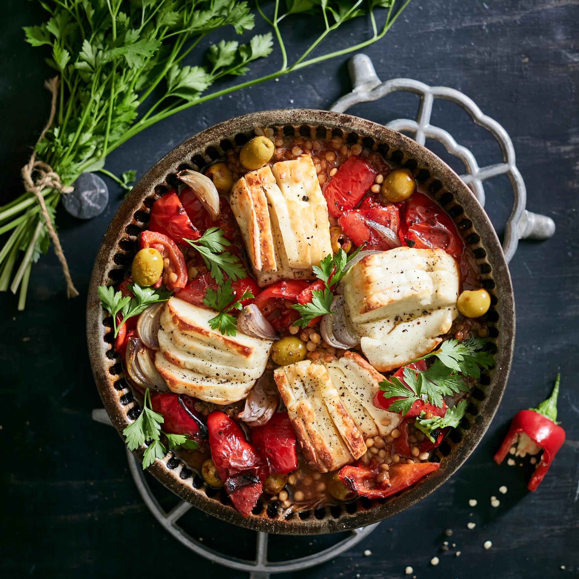 - Leikkaa halloumipalat puoliksi. Leikkaa palat viipaleiksi siten, että viipaleet jäävät alareunasta kiinni toisiinsa. Nosta palat paprikapaistoksen päälle. Lisää oliivit. Jatka paistamista vielä 15 minuuttia, kunnes halloumi on ruskistunut kauniisti. Viimeistele paistos lehtipersiljalla tai basilikalla.