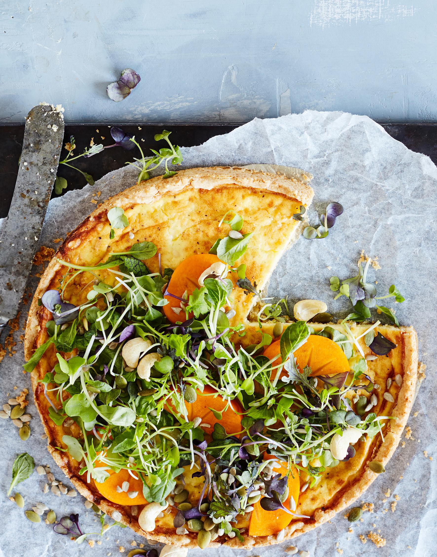 - Lisää haalean piirakan päälle silmusalaattia, persimoniviipaleita ja siemensekoitusta. Viiruta gluteeniton piirakka halutessasi balsamikastikkeella juuri ennen tarjoilua.