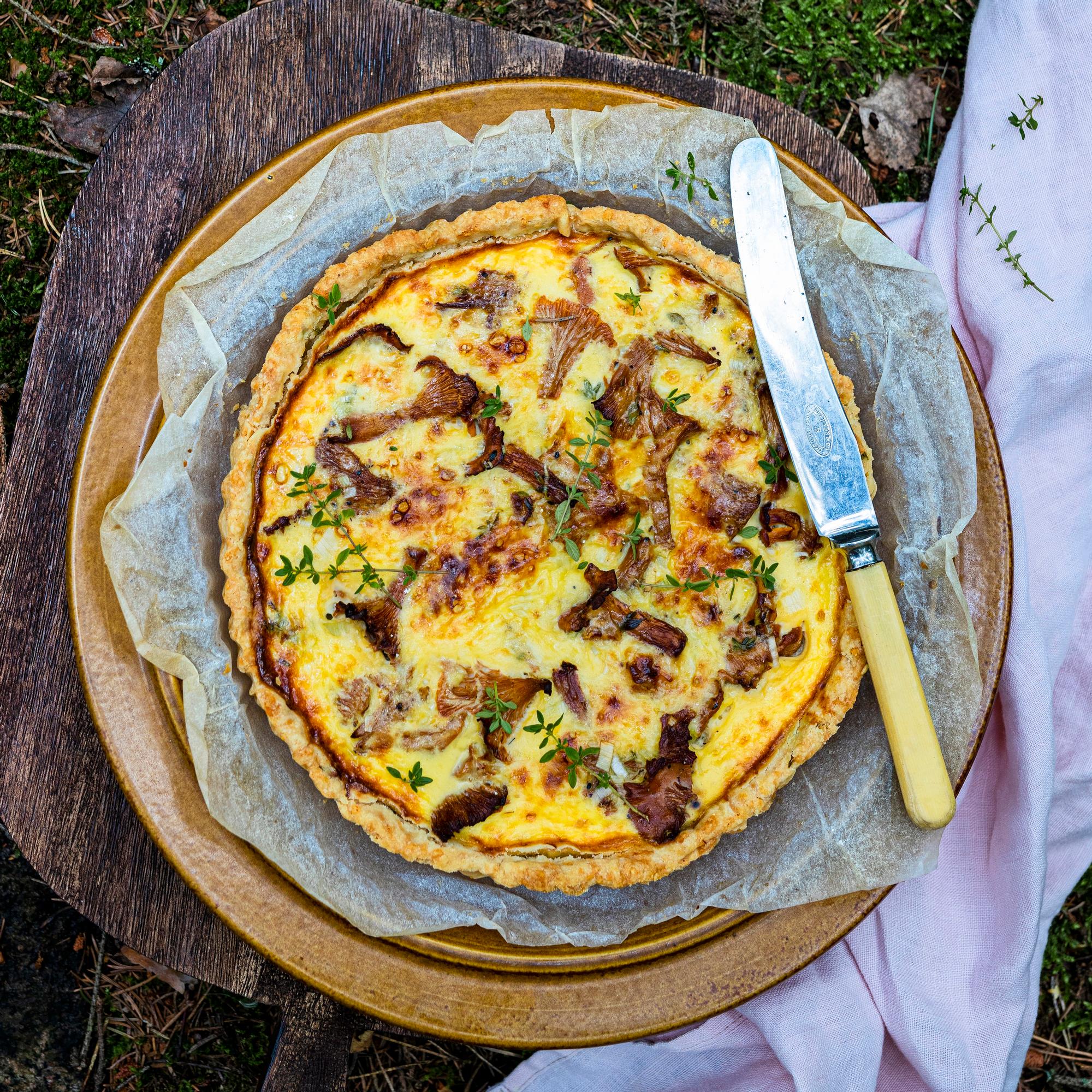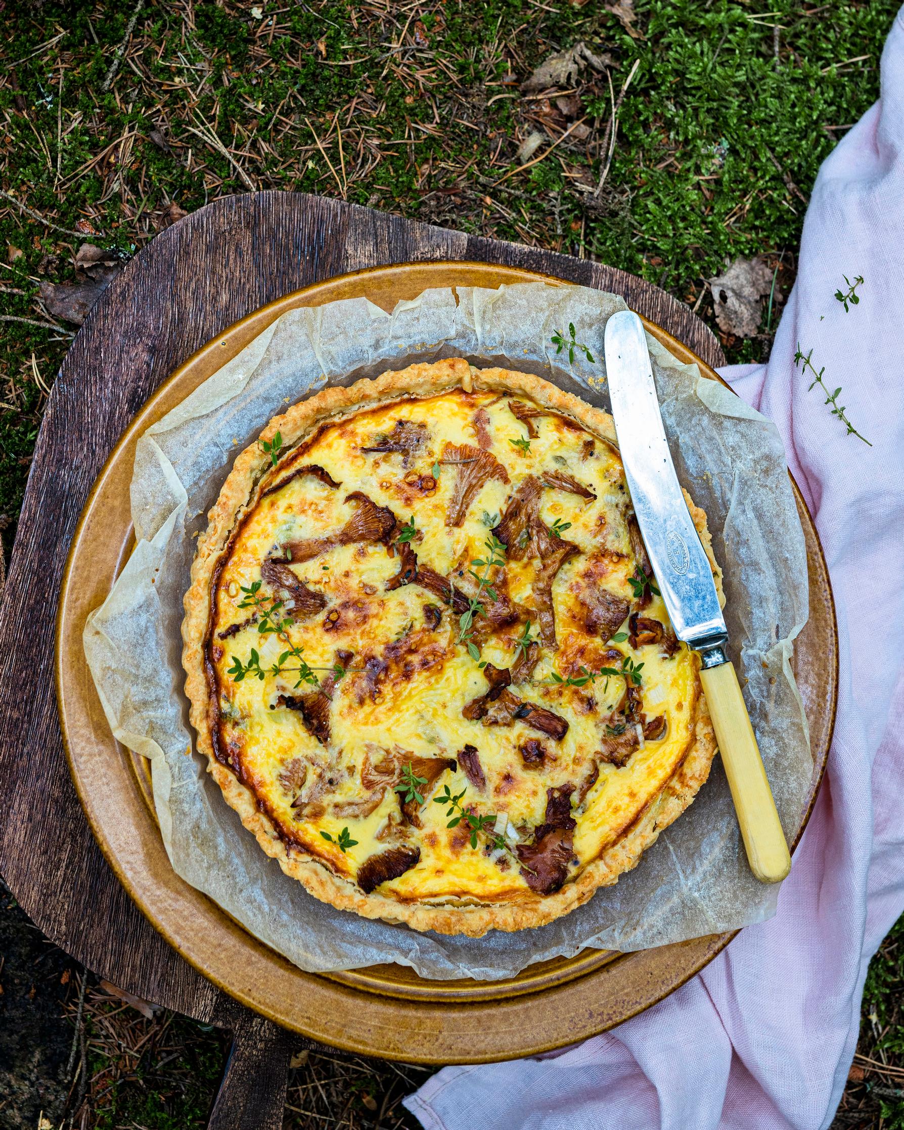 Kenties kaikkien aikojen paras kantarellipiirakka on tässä! Suolainen murotaikinapohja ja täyte saavat makunsa aromikkaasta Västerbotten-juustosta ja tuoreesta timjamista.