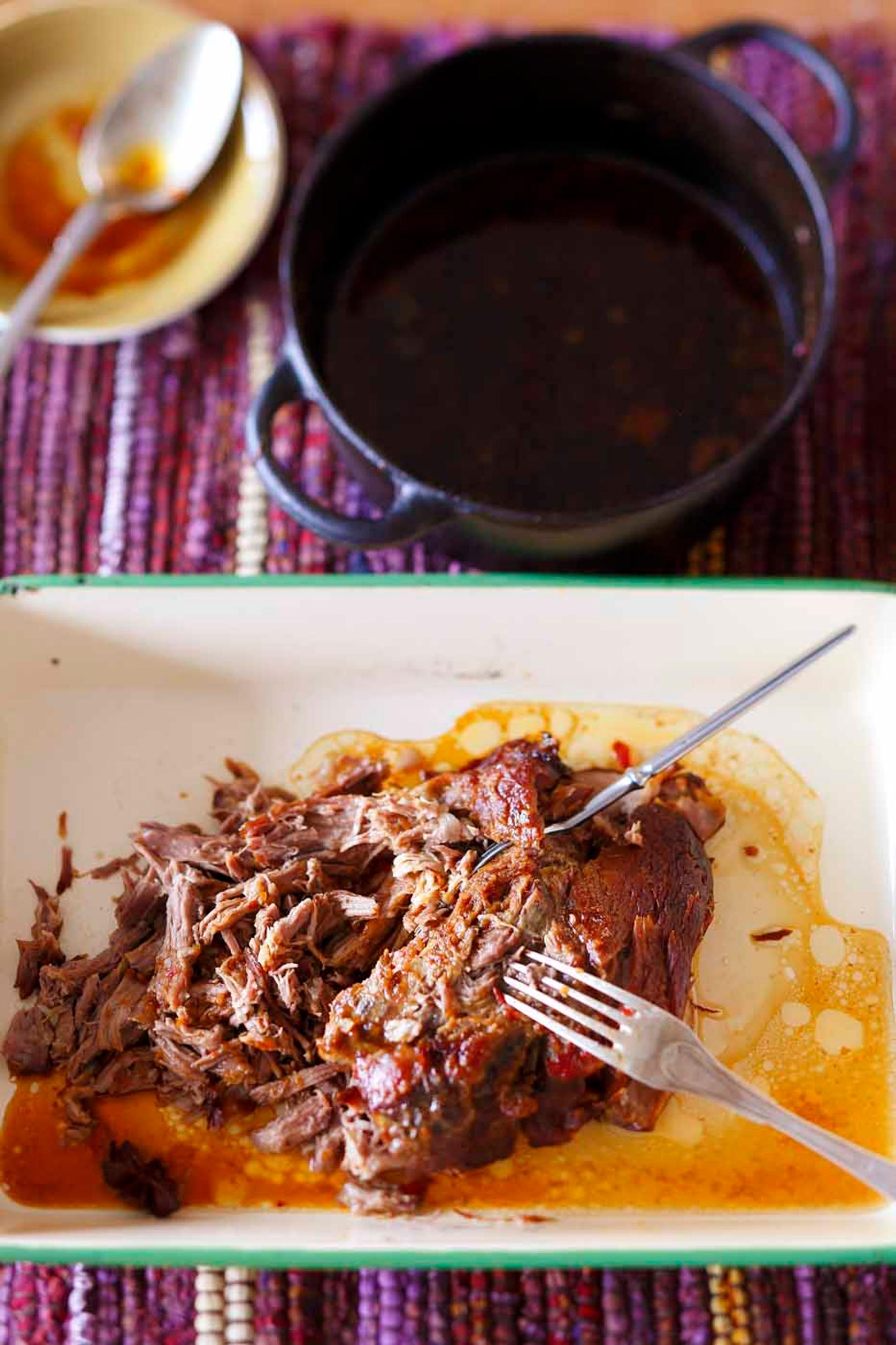 4. Nosta nyhtöpossu pois liemestään ja revi se hienoksi. Maista lihaa ja ripottele pinnalle tarvittaessa suolaa. Lisää lihan päälle reilusti siivilöityä lientä, joka takaa lihan mehevyyden. Tarjoa esimerkiksi pitaleivän välissä.