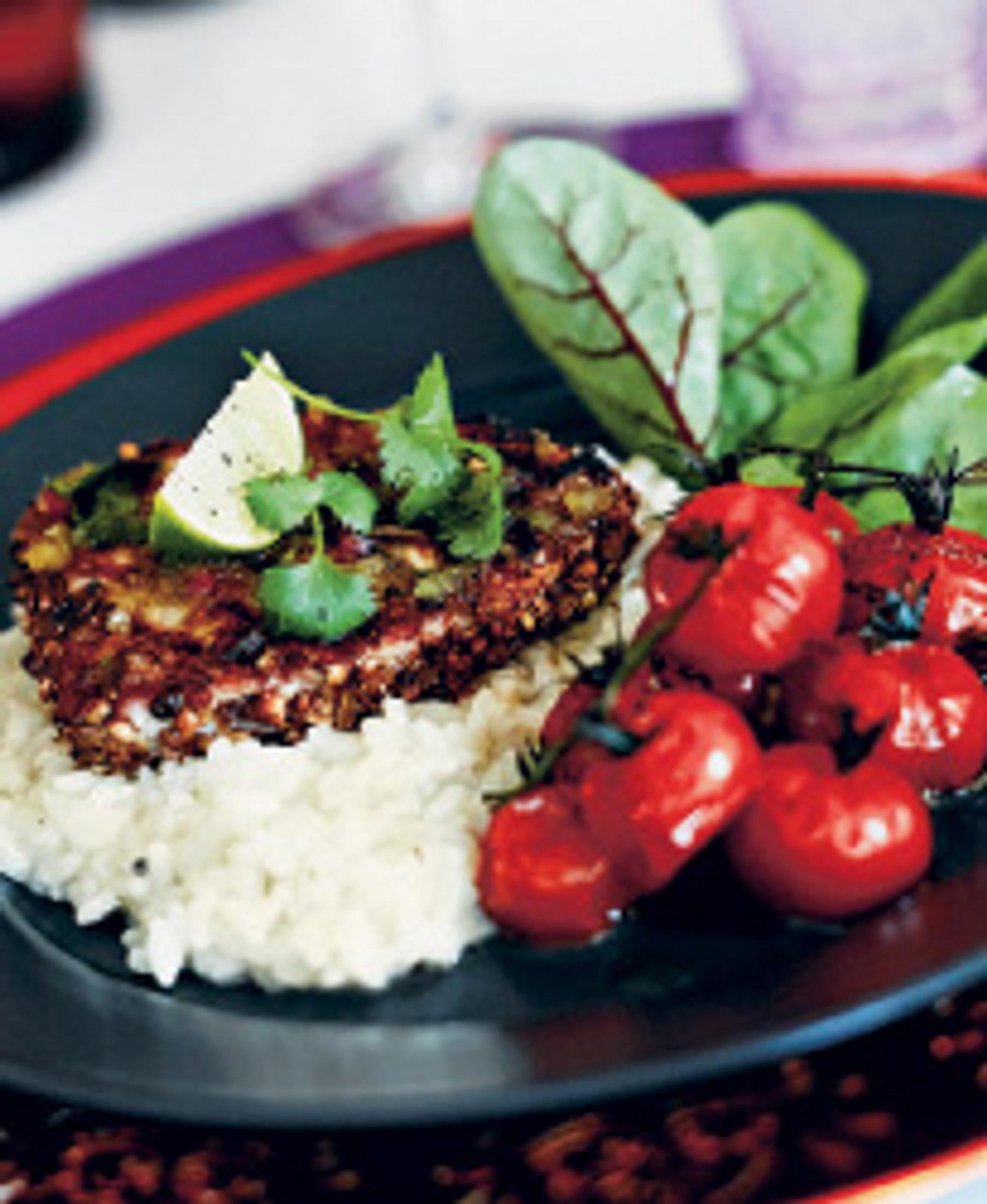 Paista nopeasti kuumalla parilalla raidat kalapalojen pintaan, sivele paistettuun pintaan runsaasti mausteseosta. Älä kypsennä liikaa, vaan tarjoa pihvit parhaimmillaan eli sisältä punaisina. Tarjoa pariloitujen tonnikalapihvien lisänä kookosriisiä ja paahdettuja terttutomaatteja.