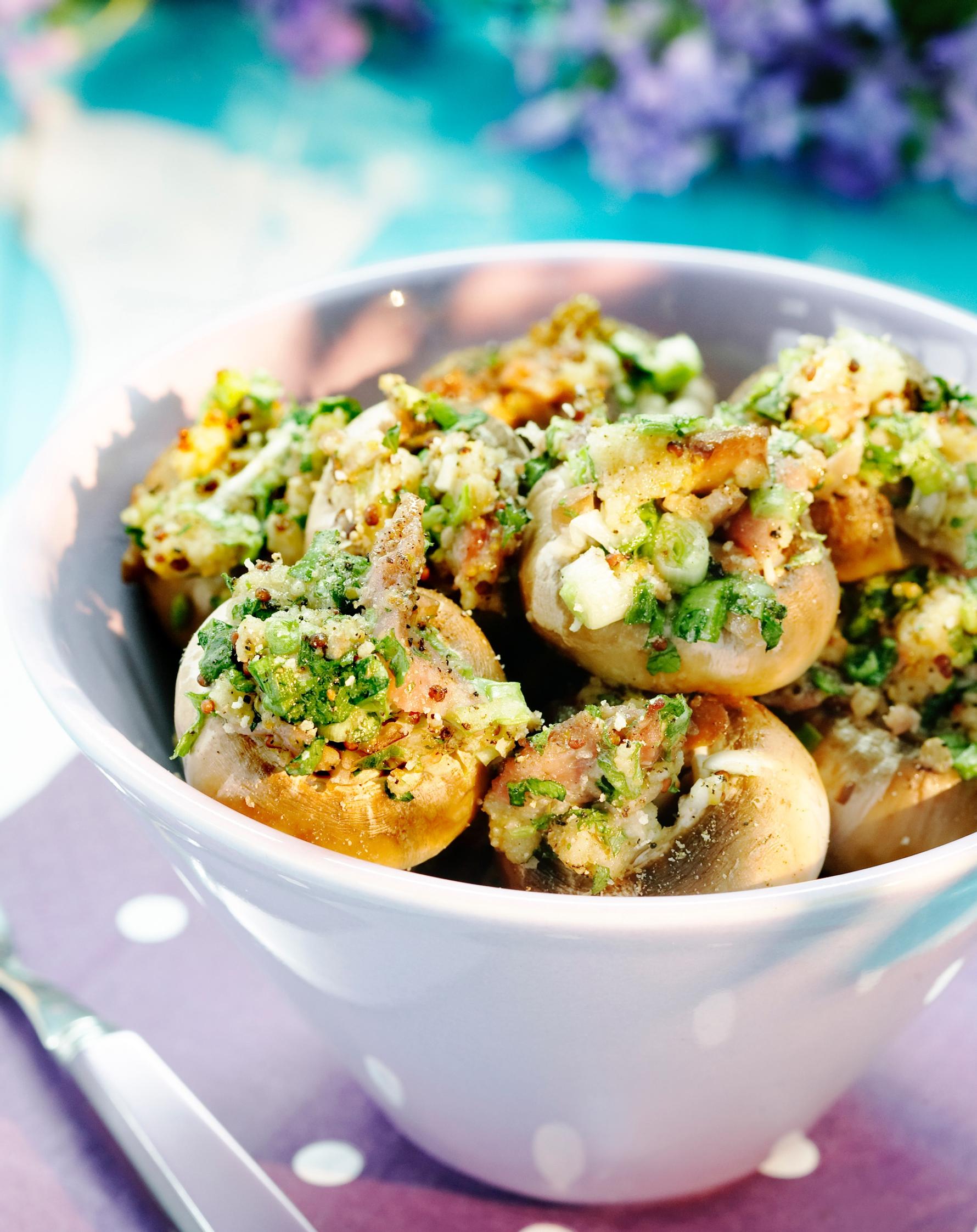 Nostele lusikalla täytettä sienten koloihin. Pirskota päälle öljyä ja leivänmuruja. Nosta loppu täyte tarjoilukulhoon ja tarjoa sitä sienten kanssa.
