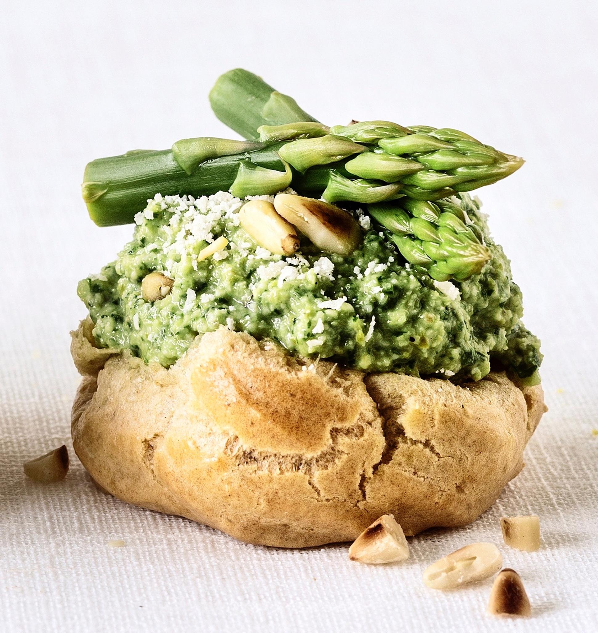 Suolaisten tuulihattujen parsatäytteessä maistuvat myös parmesaani, pinjansiemenet ja tuoreet yrtit.