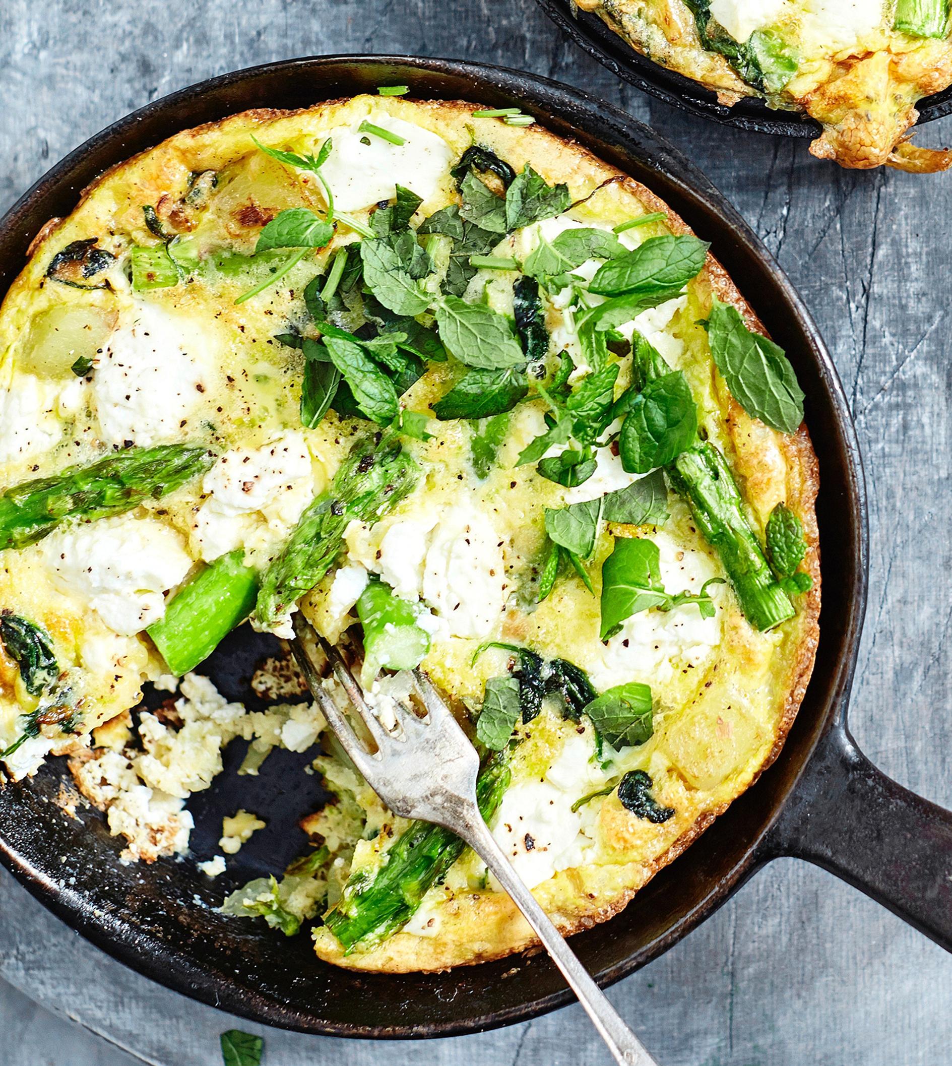 Kuumenna uuninkestävällä paistinpannulla (Ø 24 cm) reilu loraus öljyä. Kuullota sipulit pannulla. Lisää parsat ja huuhdottu pinaatti. Paista pari minuuttia. Lisää perunat ja kääntele hetki.