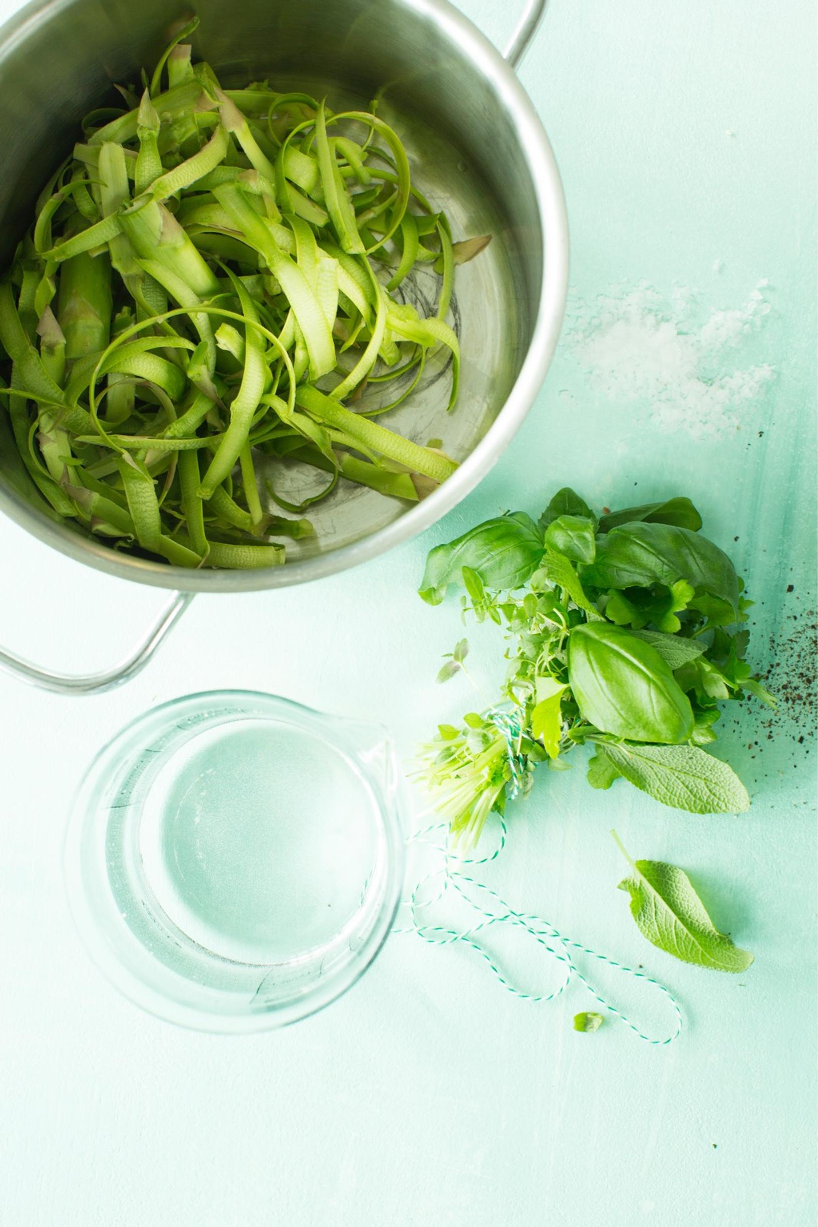 Keitä parsojen kuoret maukkaaksi kasvisliemeksi, joka sopii risottoon ja keittoon.