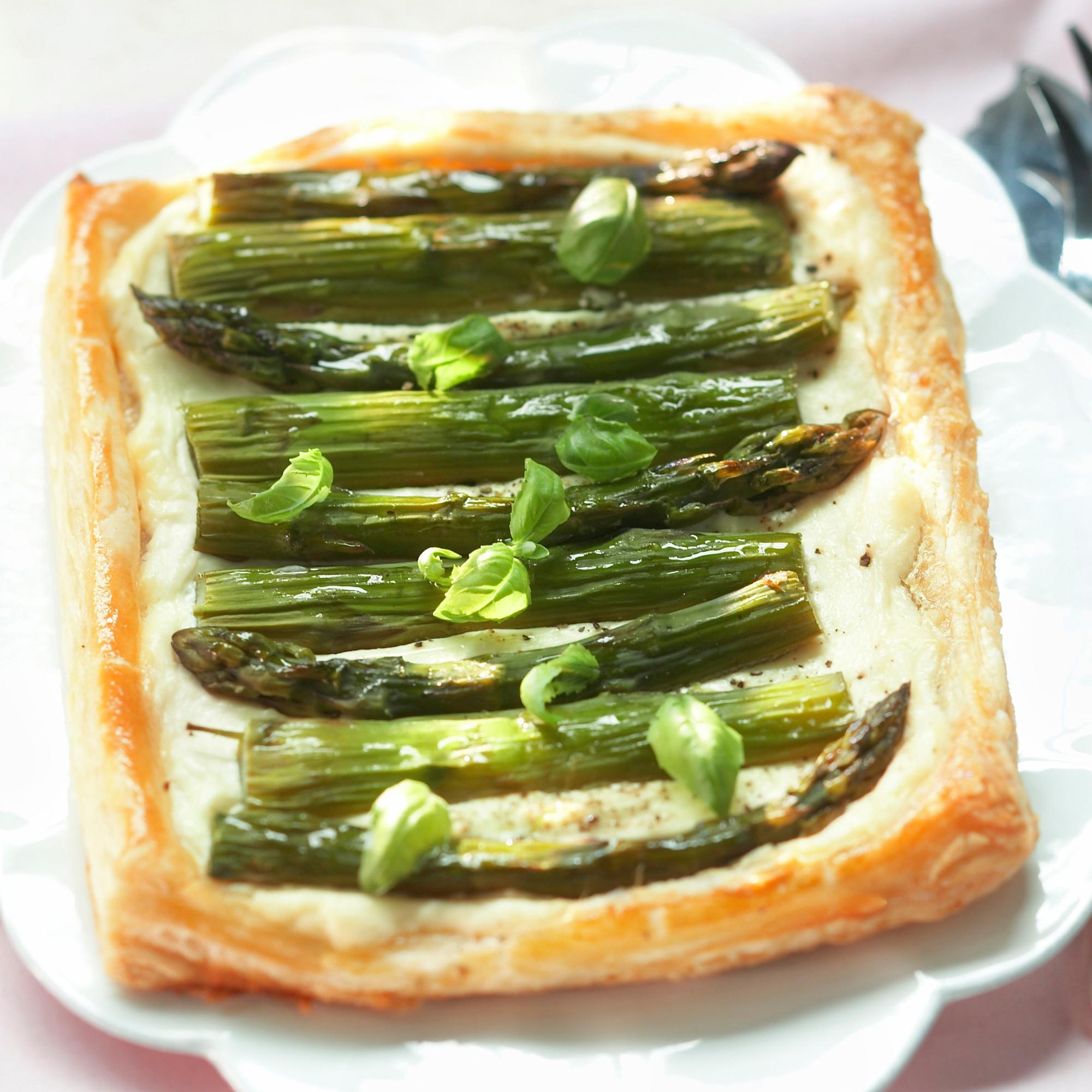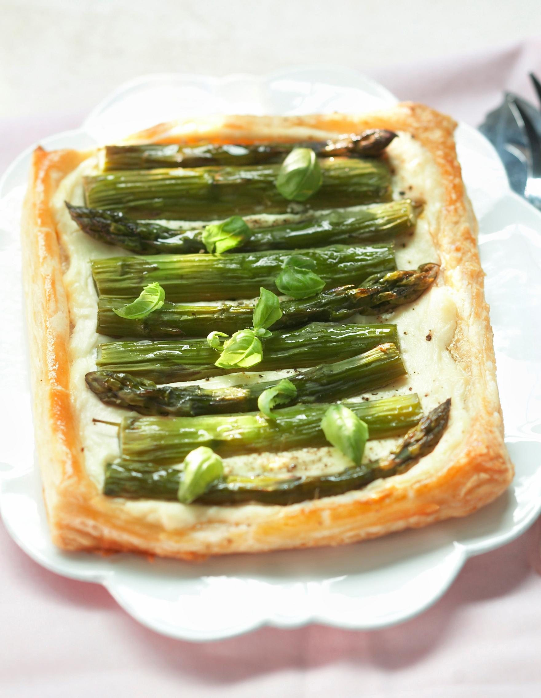 - Levitä tuorejuustoseos taikinapalojen päälle viiltämiesi reunojen sisäpuolelle. Asettele parsat tuorejuuston päälle. Rouhaise pintaan mustapippuria.