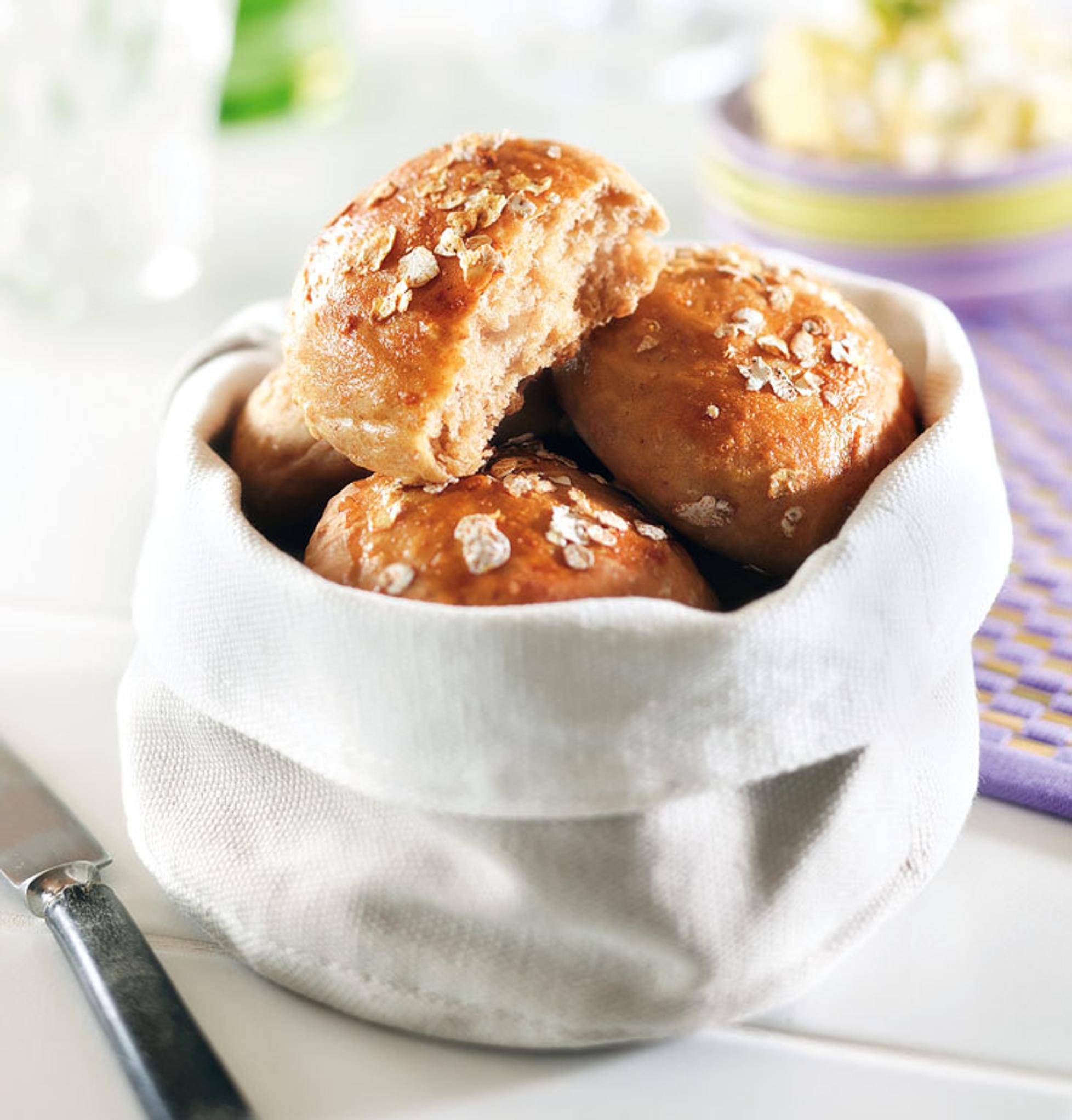 - Voitele sämpylät halutessasi munalla ja ripottele päälle ruishiutaleilta.