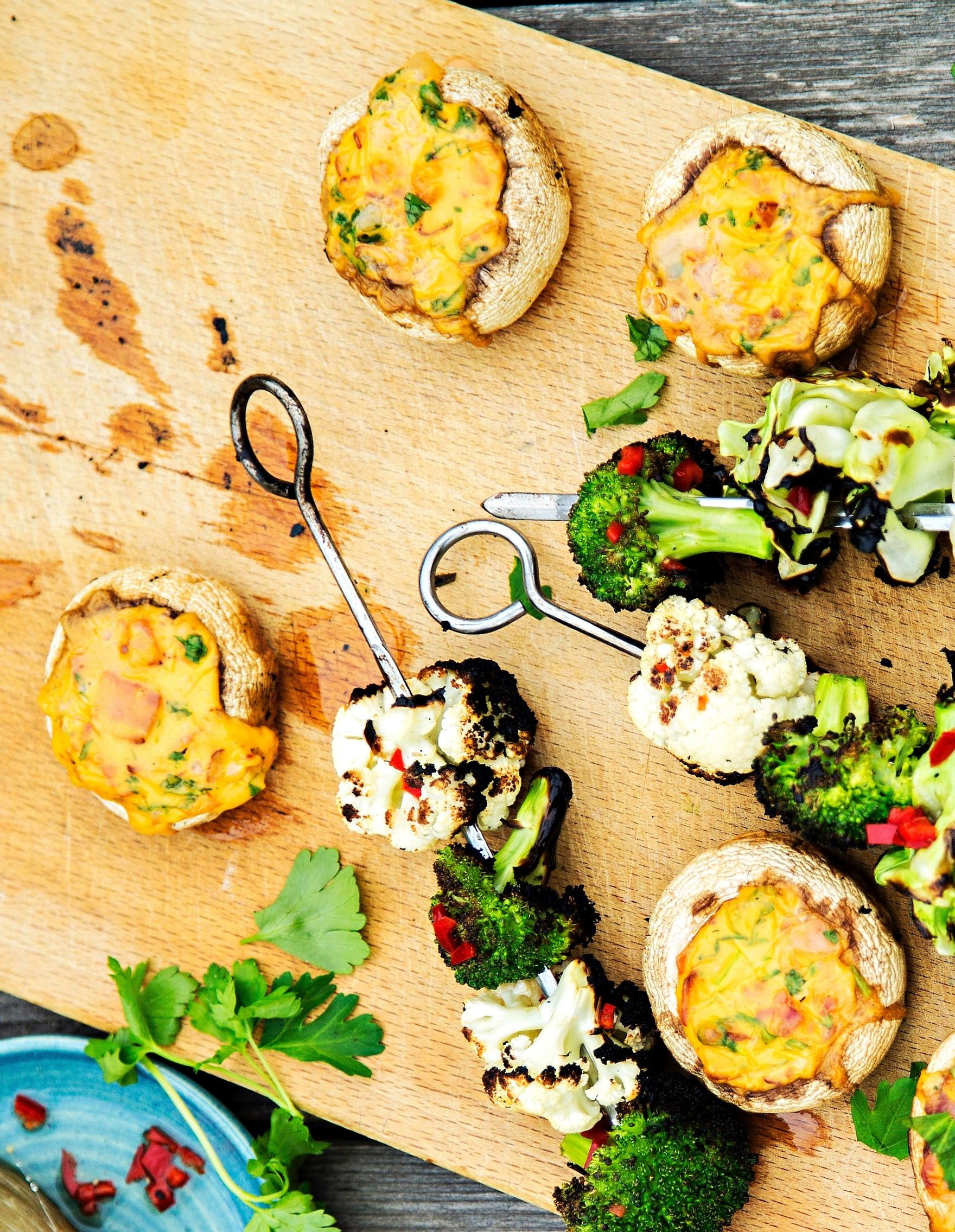 Grillaa täytettyjä herkkusieniä miedolla tai keskilämmöllä kolopuolet ylöspäin 5–10 minuuttia.