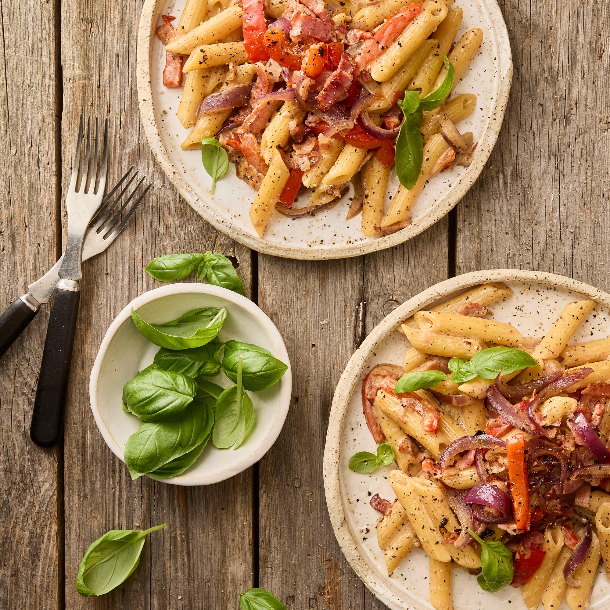 Pekonipasta valmistuu nopeasti arjenkin tohinoissa. Väriä ja makua tämä pasta saa paprikasta ja punasipulista. Kokeile vaikka jo tänään ja nappaa helppo resepti talteen!