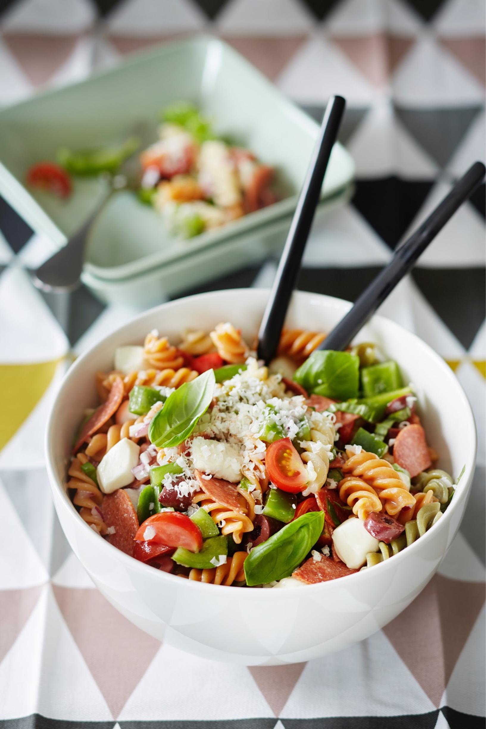 Pastasalaatti sopii niin noutopöytään kuin maukkaaksi lounaaksi. Tämä pastasalaatti saa makua pepperonista, mozzarellasta ja tomaateista.
