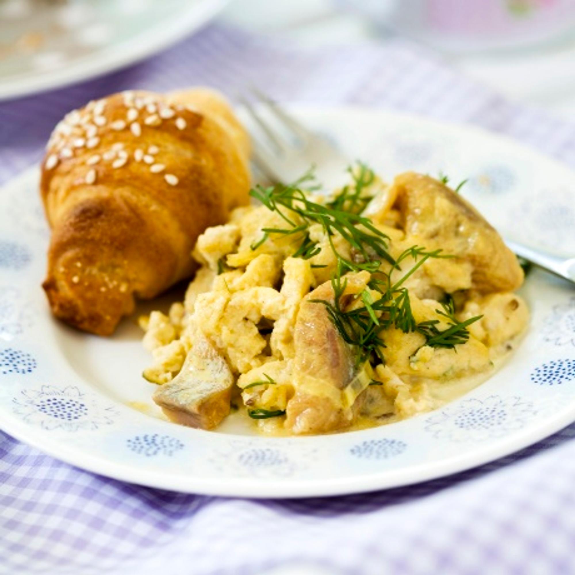 - Öljyä pannu. Hyydytä munaseos pehmeän meheväksi miedolla lämmöllä, koko ajan sekoittaen. Mausta silputuilla yrteillä