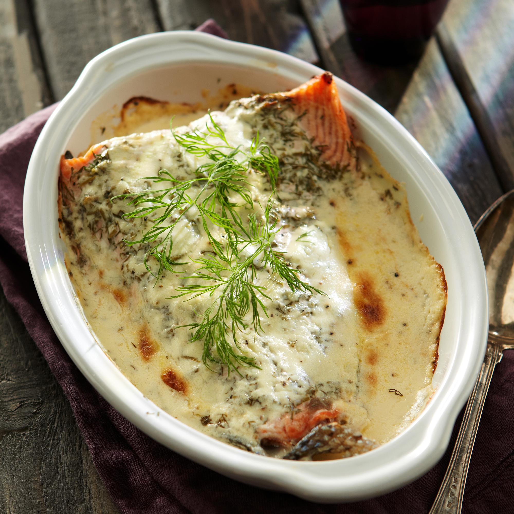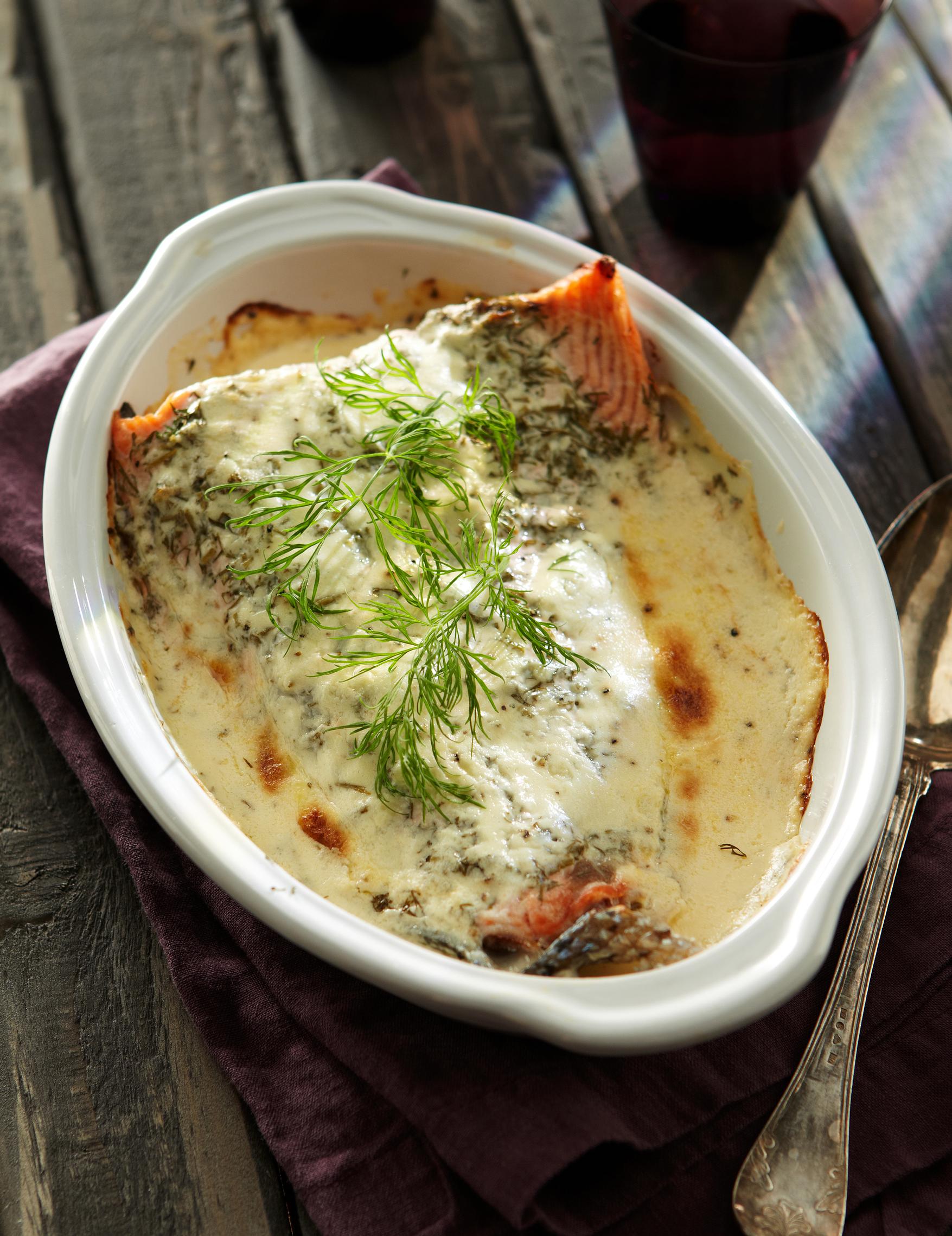 - Nosta kalafilee uunivuokaan nahkapuoli alaspäin. Ripottele päälle tilli. Sekoita ranskankerma, suola, pippuri ja sitruunamehu keskenään. Kaada seos lohen päälle.