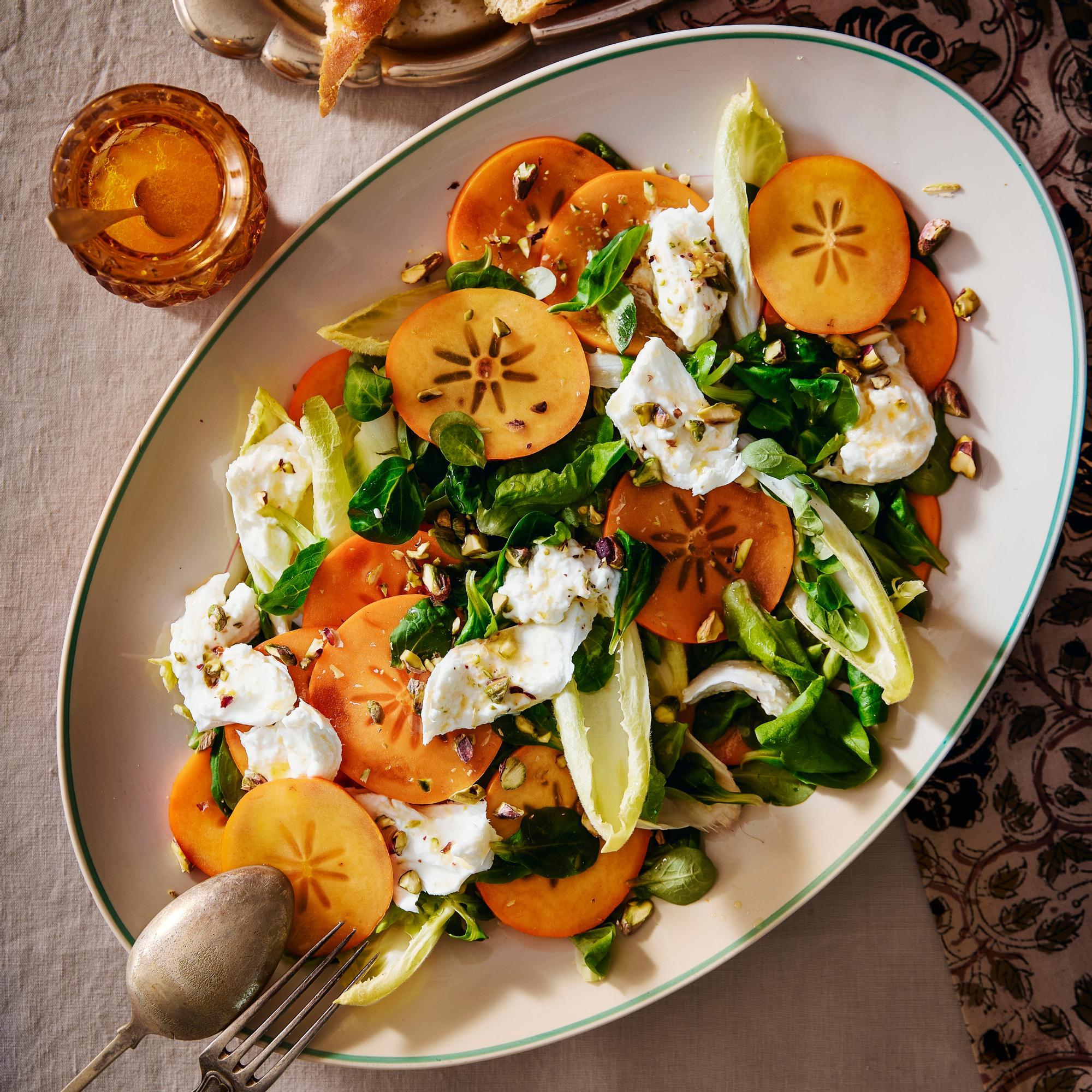 Makea persimon ja pehmoinen buffalajuusto kohtaavat hienostuneessa salaatissa, joka on helppo tarjottava isollekin porukalle. Tee mandariini-vinegretti jääkaappiin valmiiksi odottamaan ja rouhi pähkinät. Itse salaatti syntyy muutamassa minuutissa juuri ennen tarjoilua.