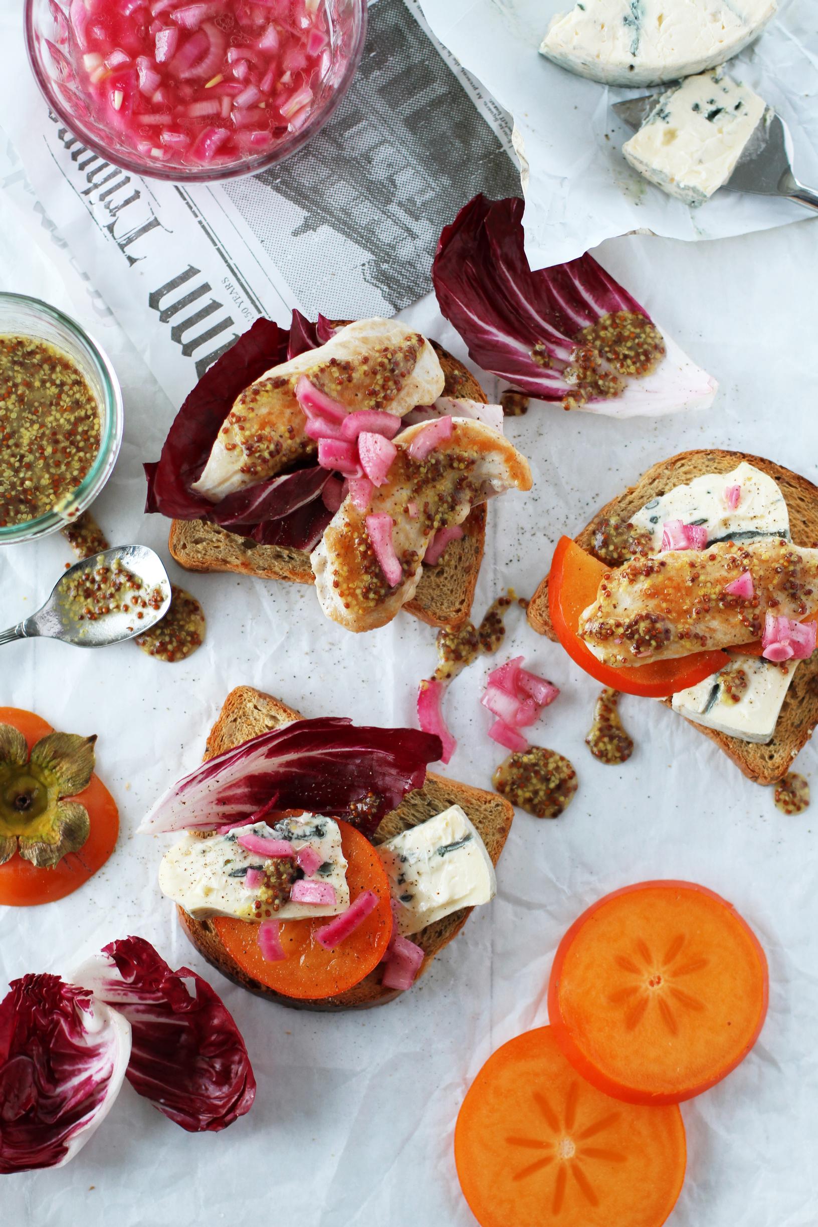 Kokoa leipäviipaleiden päälle persimonviipaleita, kanaa, sinihomejuustoa ja punasalaattia. Lusikoi päälle pikapikkelöityjä sipuleita ja sinappikastiketta.