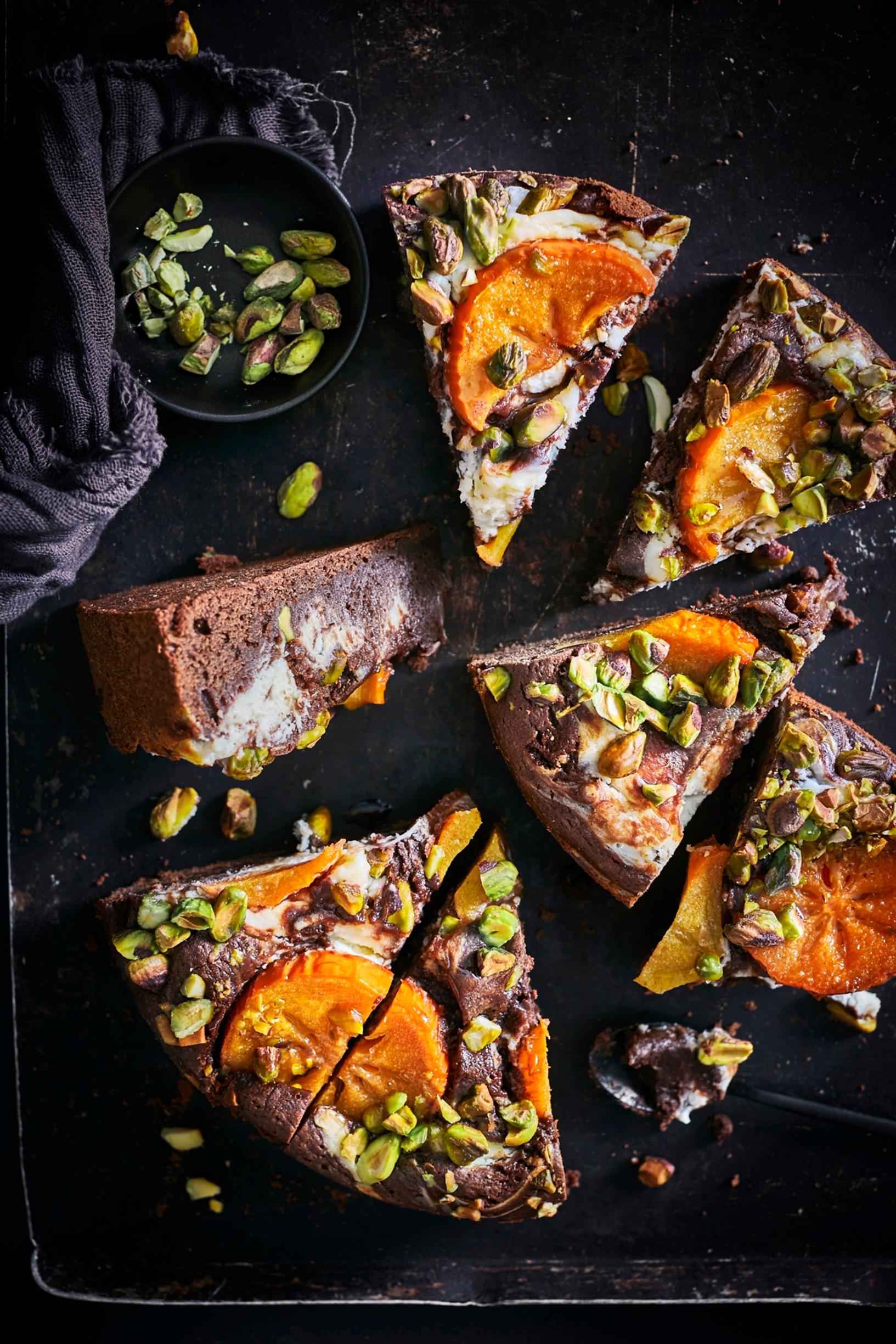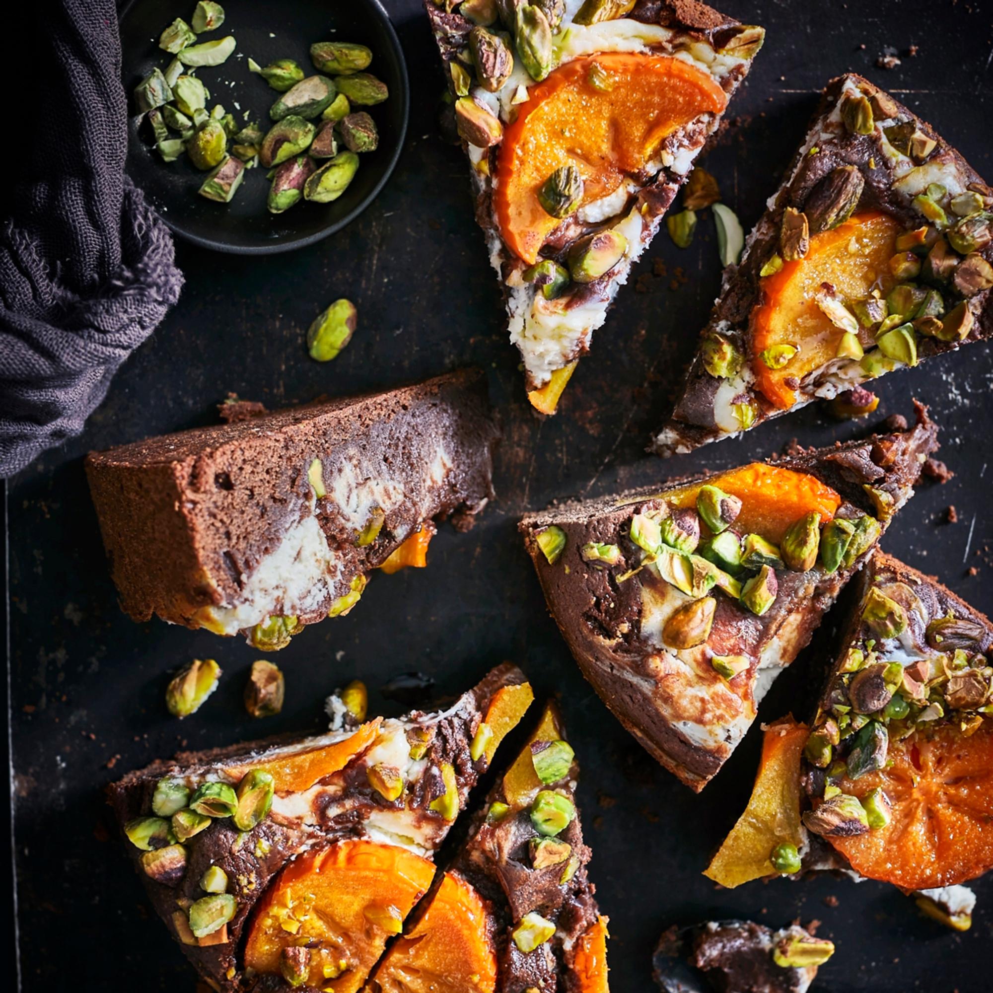 Suklaan, persimonin ja pistaasipähkinän makutrio pistää parastaan tässä paistetussa juustokakussa.