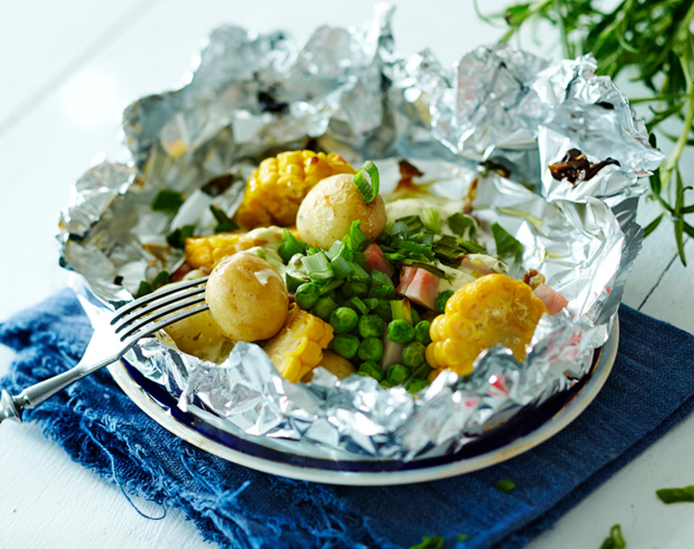 1. Viipaloi isot perunat. Pienet voit käyttää kokonaisina. Paloittele savukylki, viipaloi maissit ja sipulit. 2. Tee kaksinkertaisesta foliosta pöydälle neljä neliön muotoista arkkia. Jaa perunat, herneet, savukylki, maissit ja sipulit arkeille. Jaa tuorejuusto neljään osaan ja levitä täytteiden päälle. Mausta suolalla, pippurilla ja yrteillä. 3. Sulje perunanyytit ja nosta joko grilliin tai 200-asteiseen uuniin noin 15 minuutiksi.